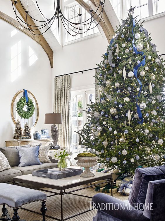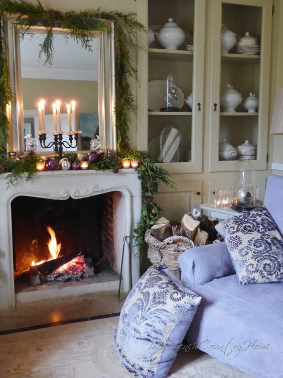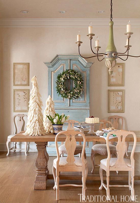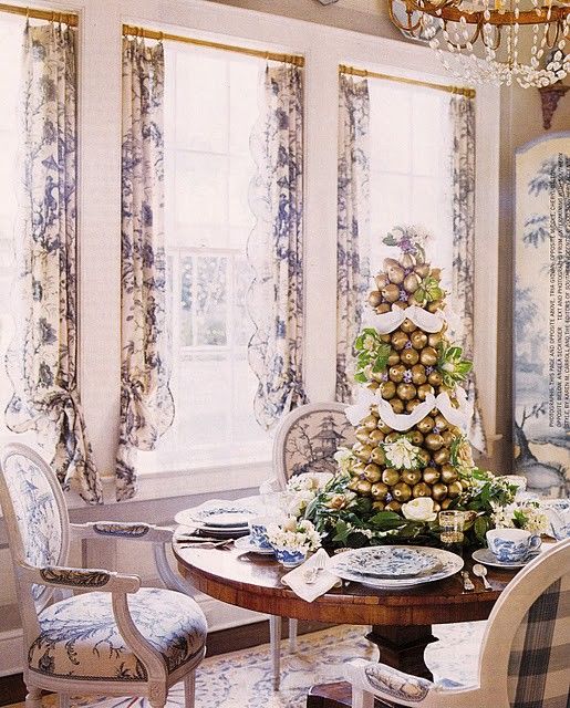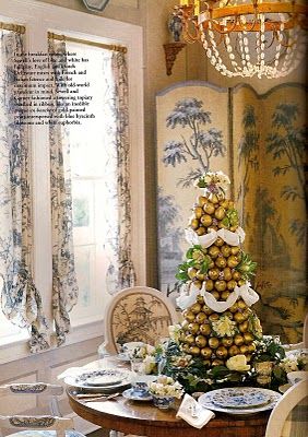 This beautiful room was featured in Traditional Home many years ago. I had the magazine and stared and stared at this photo. I love the mix of rustic, tapestries and fresh blue and white and the tree is filled with vintage ornaments, including some reds and golds. Mr. Faudree was probably the start of my love for French Country. I'm sure he was for many others, too!