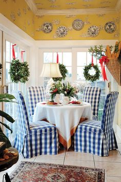 This blue and white breakfast room is so pretty with the yellow toile walls and the red ribbons.