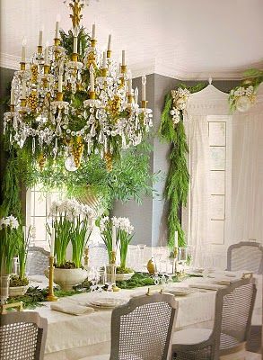 These two dining rooms are so similar and both are so beautifully filled with fresh greenery and over the top bling! The gold ribbons are beautiful!
