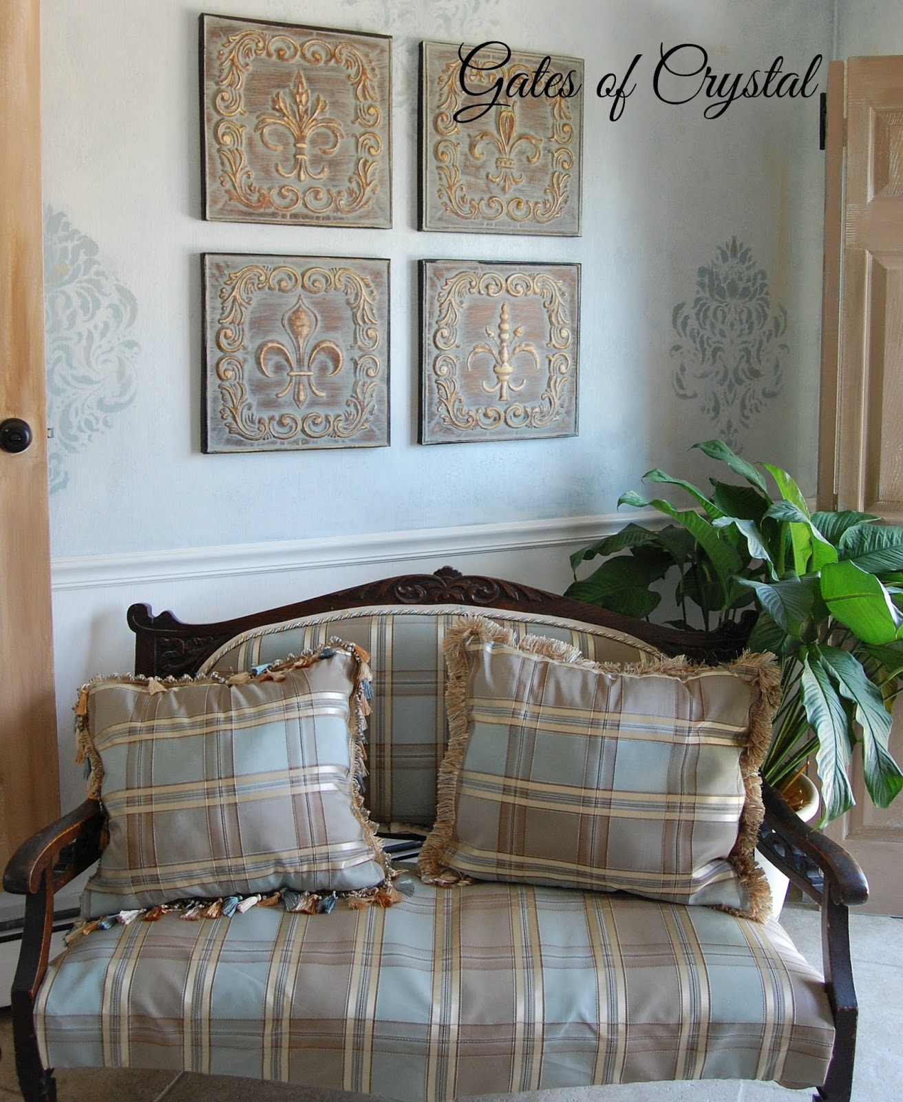 Funny story about this gold stump...I was shopping online one day for something fun and whimsical to put next to the settee when I found a very similar gold stump. I marked it to think about, and come back later to purchase, if I decided I wanted it. Just a few days later, I was in HomeGoods in Grand Rapids with our daughter and one of the first things I spotted when we walked into the store was this gold stump! I promptly put it in my cart and it rode around the store with us until we left with it.