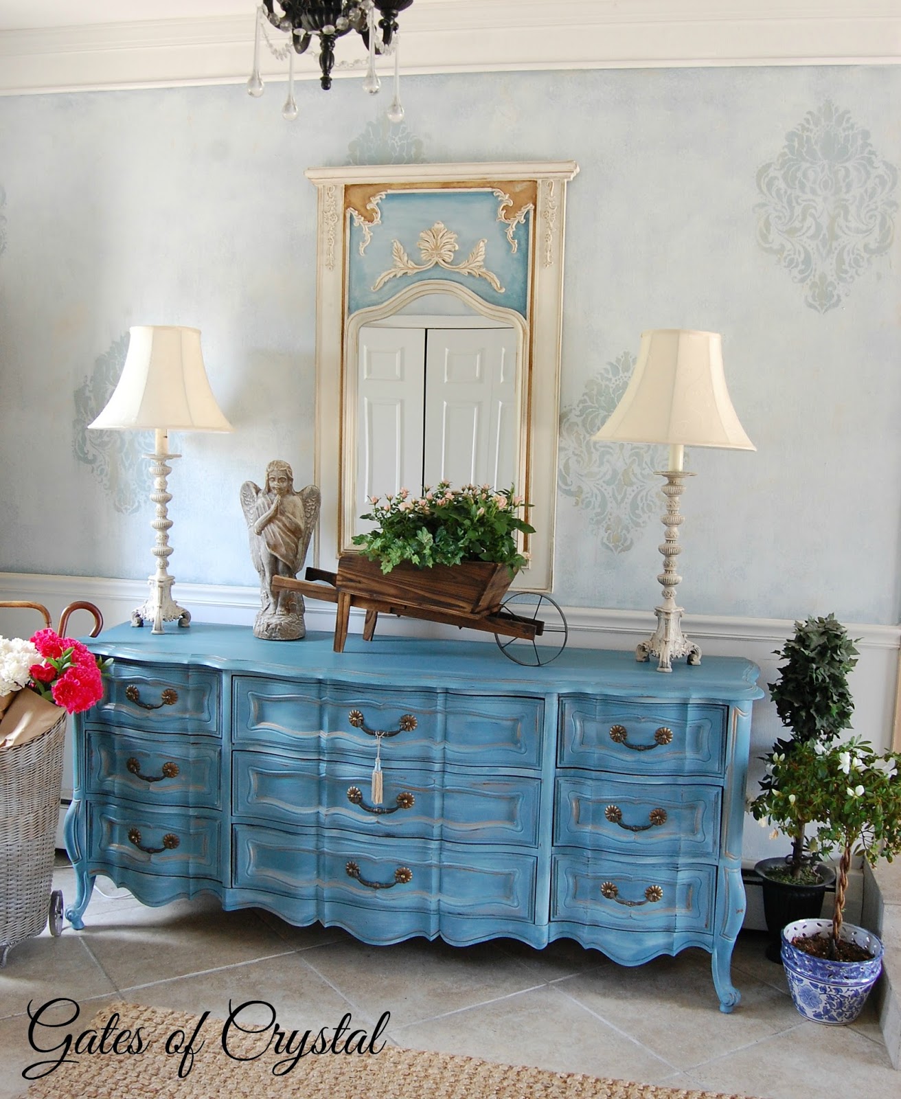 I ordered this teal velvet on line, which is always a risk, but when it arrived it was even more delicious than I had imagined. I had ordered all they had left and had just enough to cover the settee and make a pillow. I love the dramatic pop of color it gives to this room. I found an almost identical teal velvet home decor fabric at our nearby Joann's Fabric and am thinking about using it elsewhere in our house.When I painted the blue buffet, I bought a sample-sized paint this same teal color and used it to deepen the color in the corners.