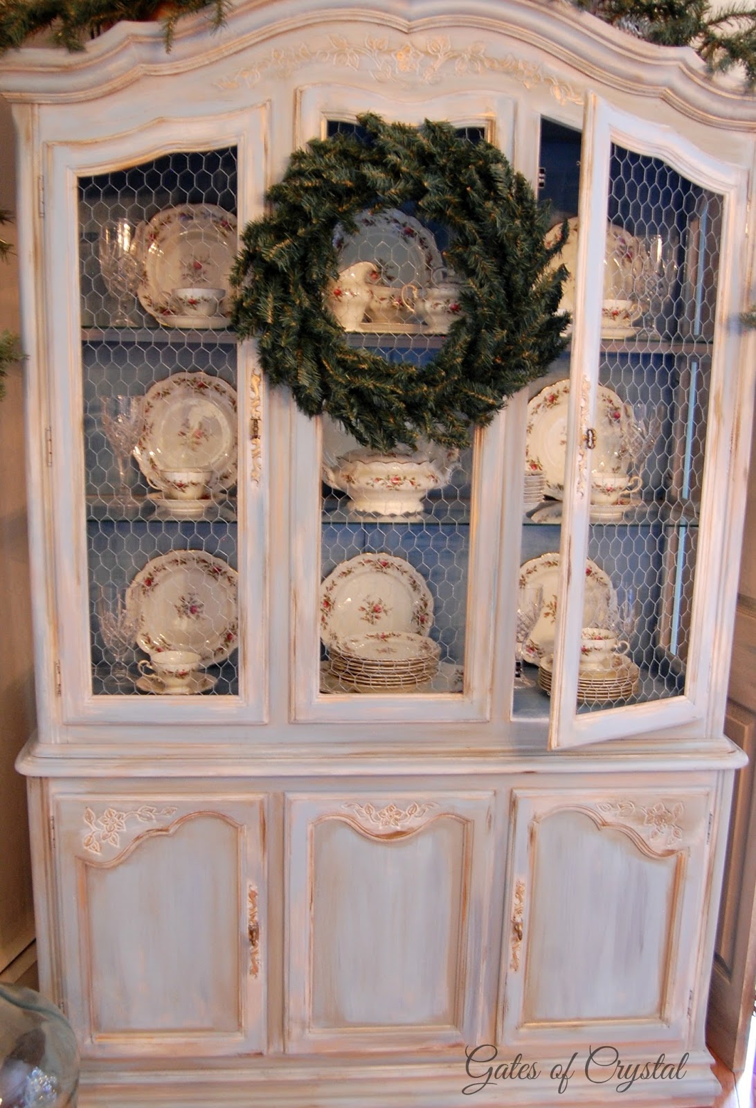 This china has been put away in the bottom of our other china cabinet and after I painted this blue, I brought it out to display it. I love the softness and dimension it adds to this area.