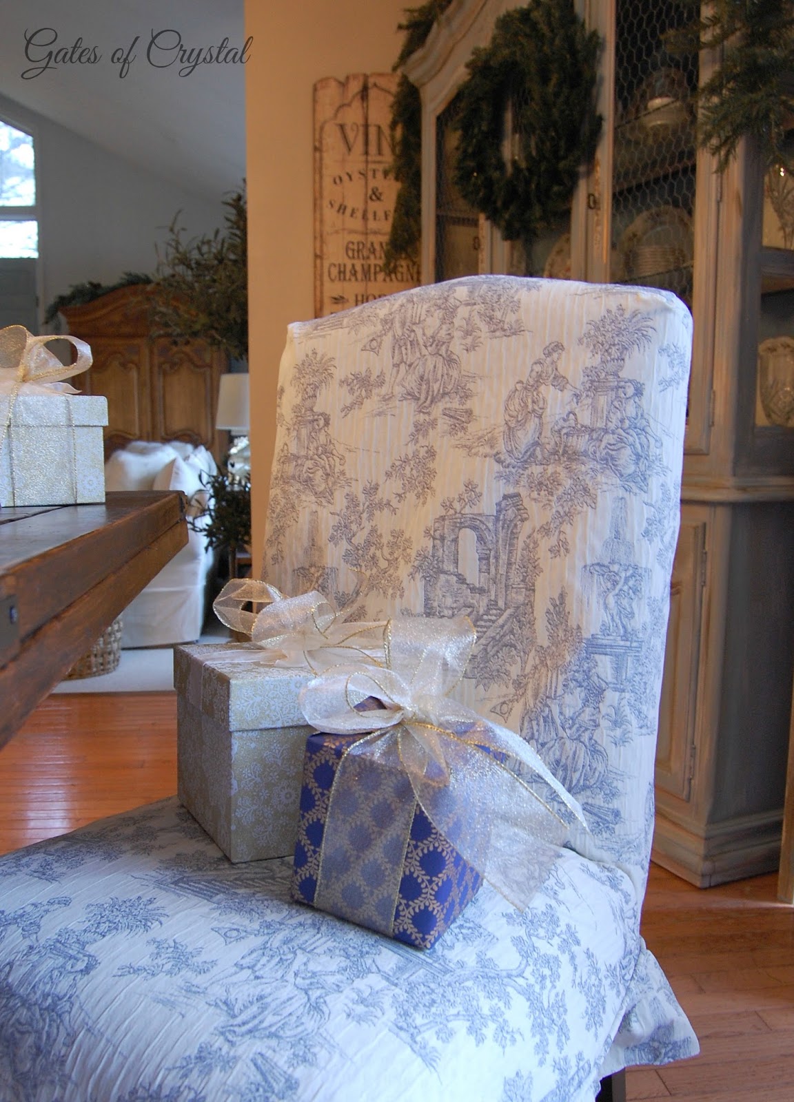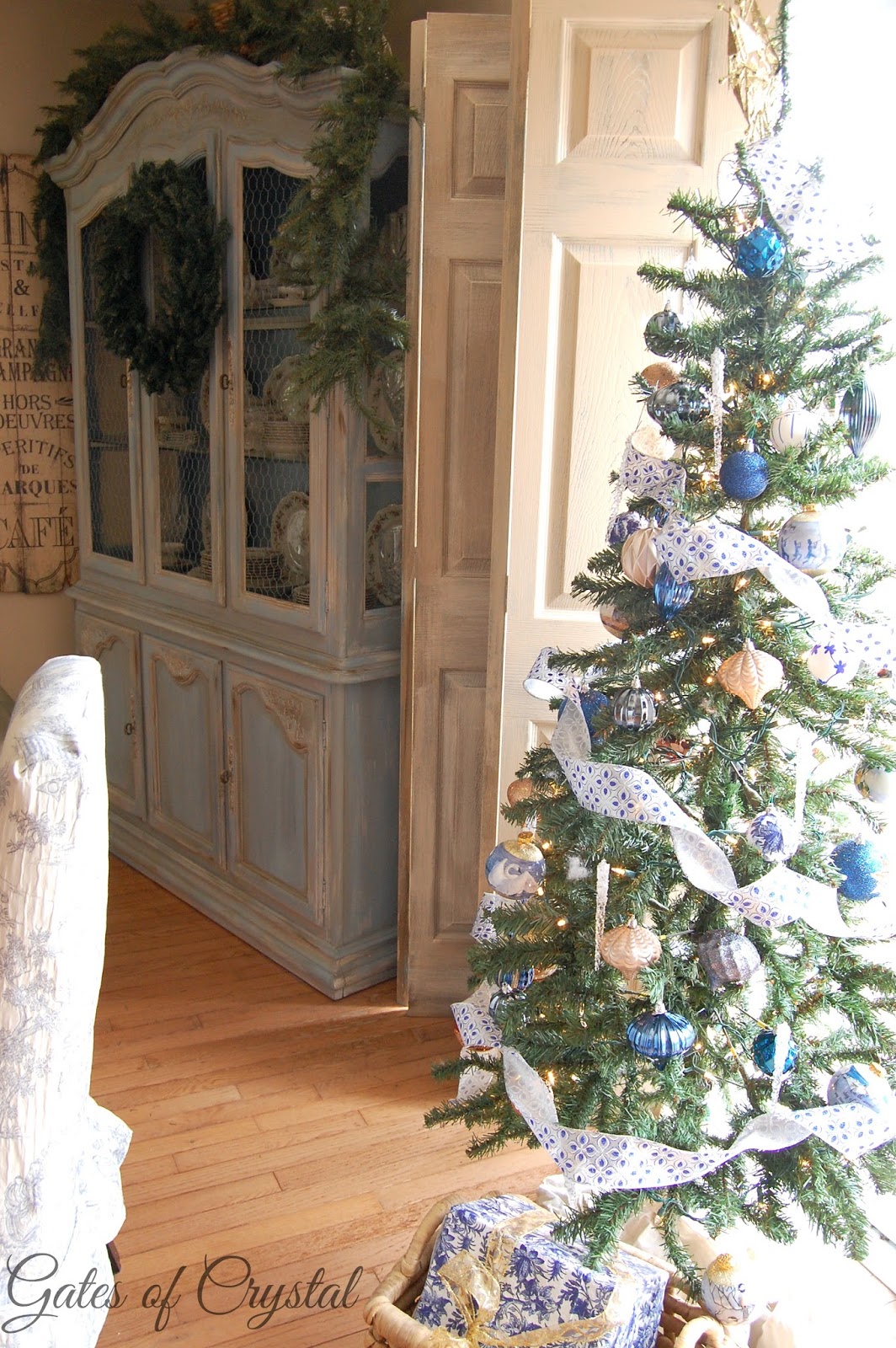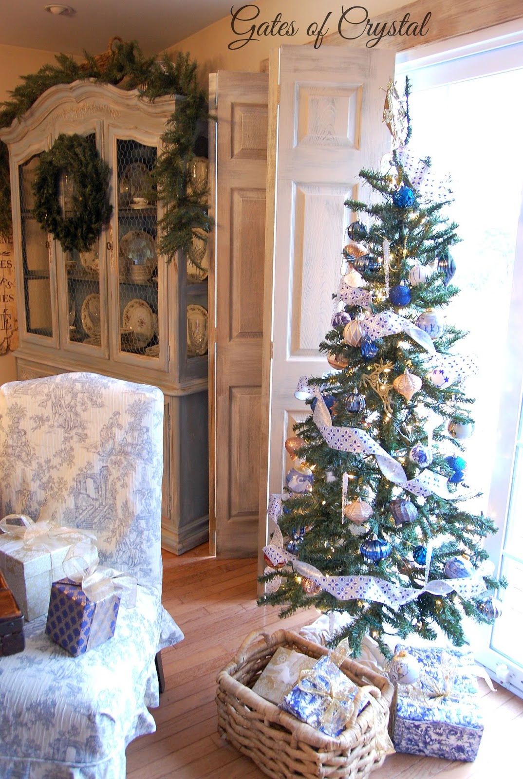 This year I decorated it in blue and gold to go with the toile and ticking in here and the living room.