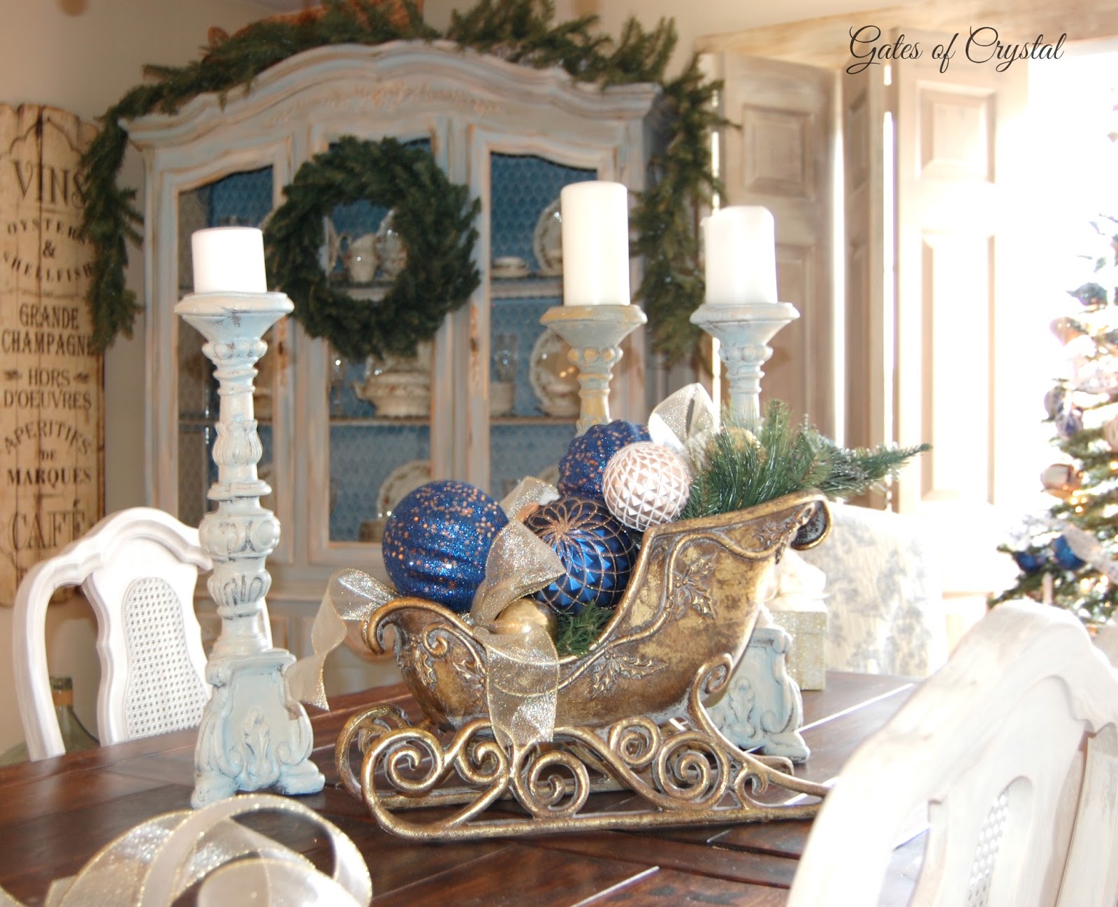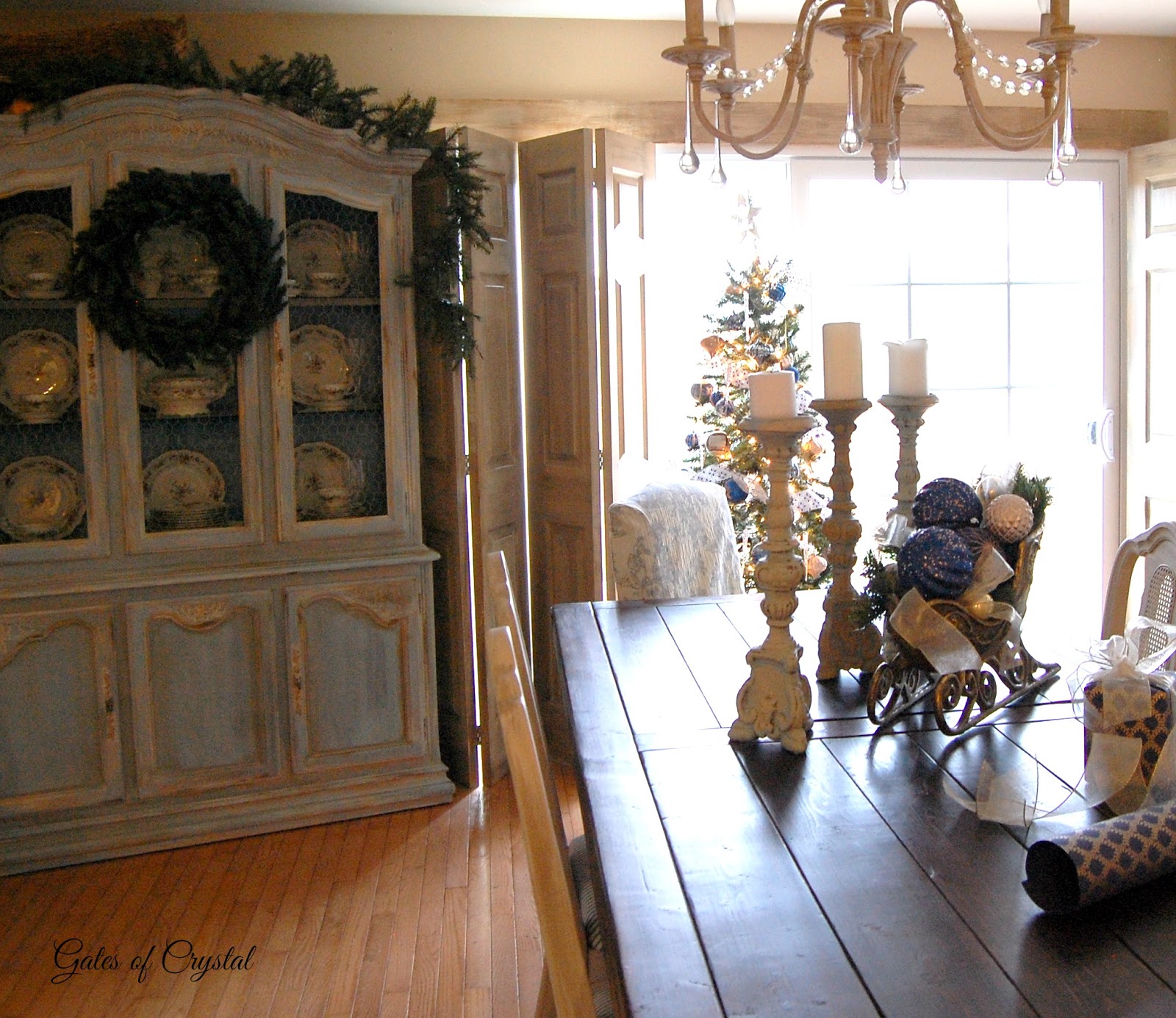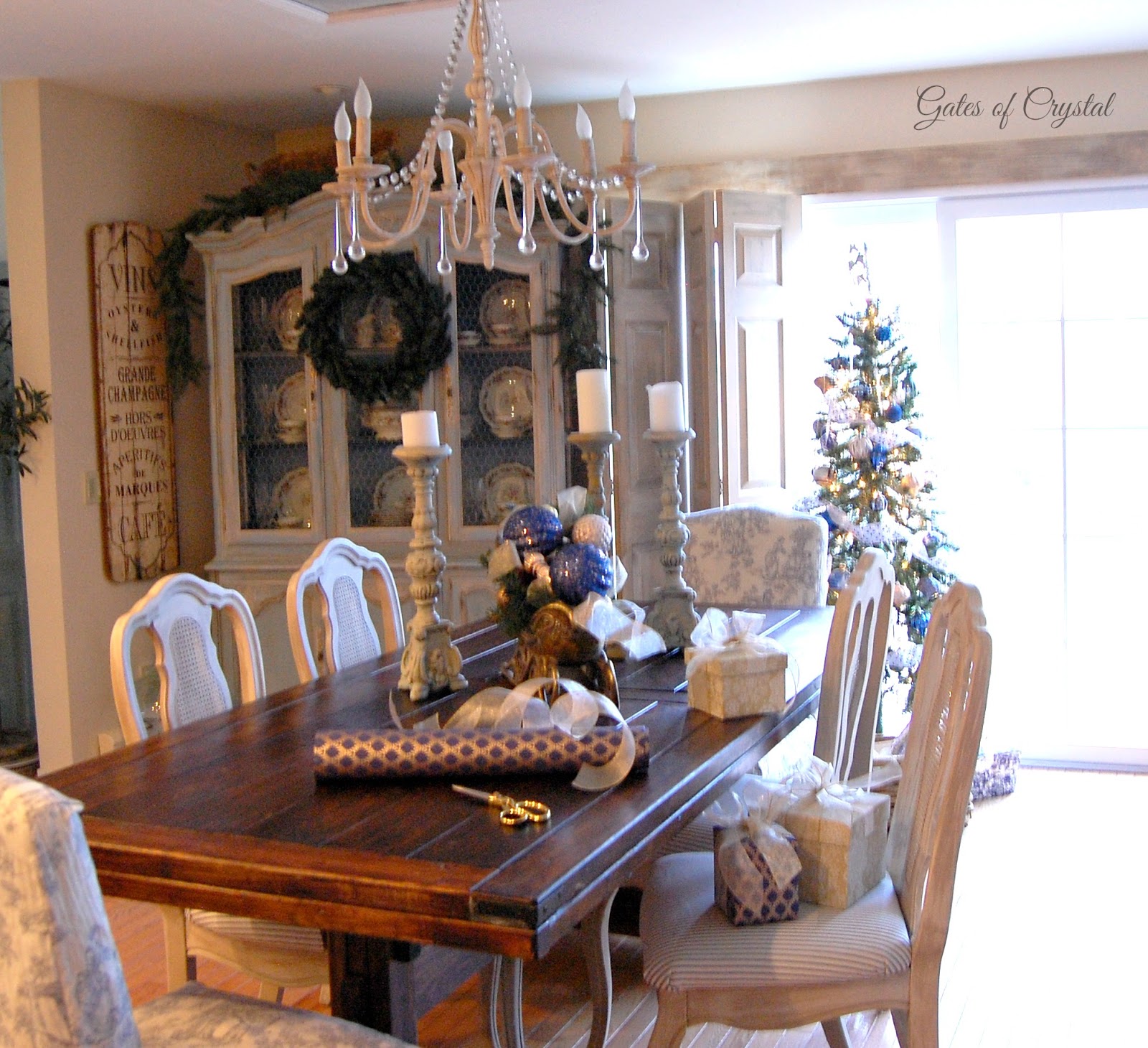 This year I decorated it in blue and gold to go with the toile and ticking in here and the living room.
