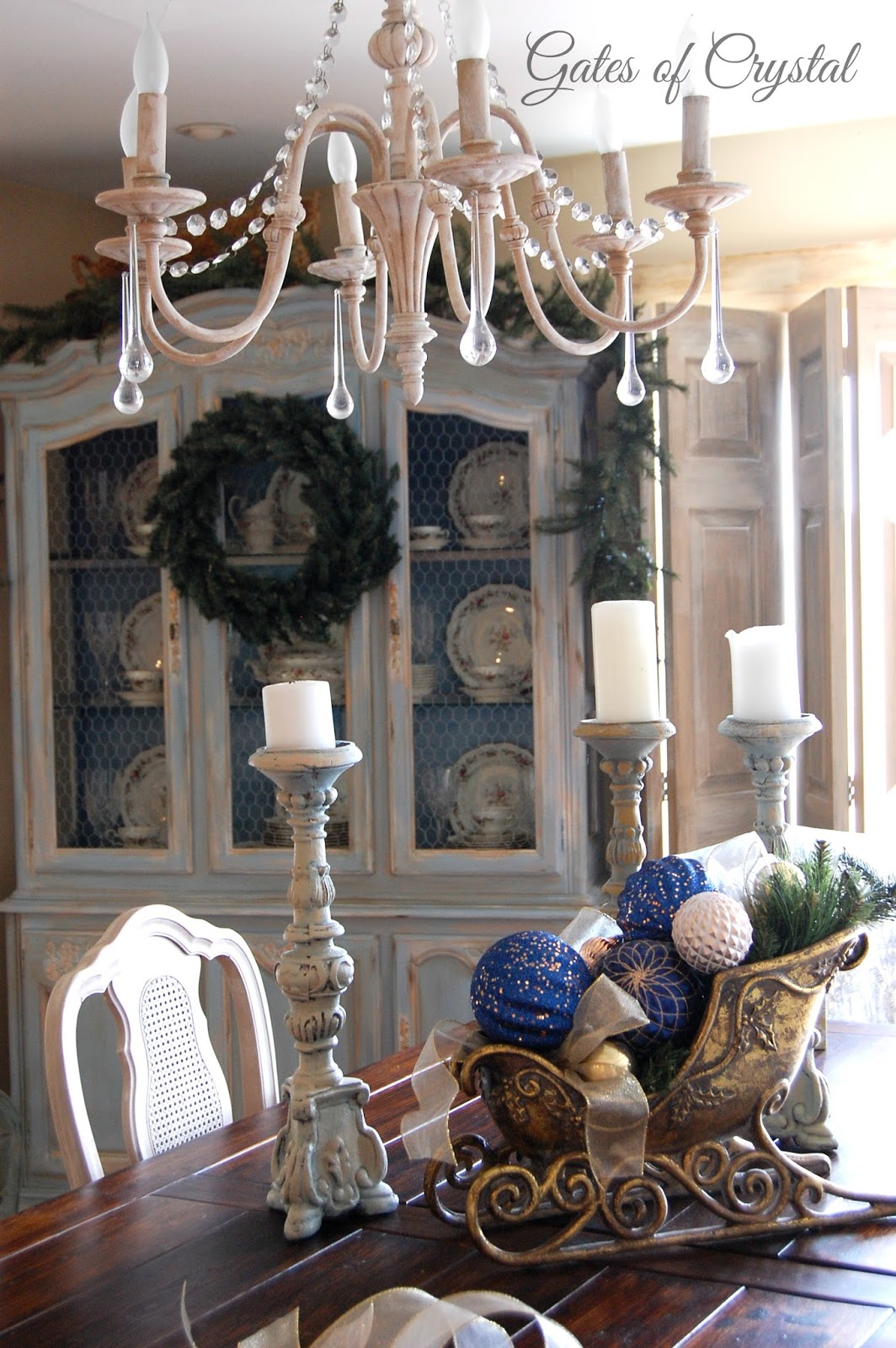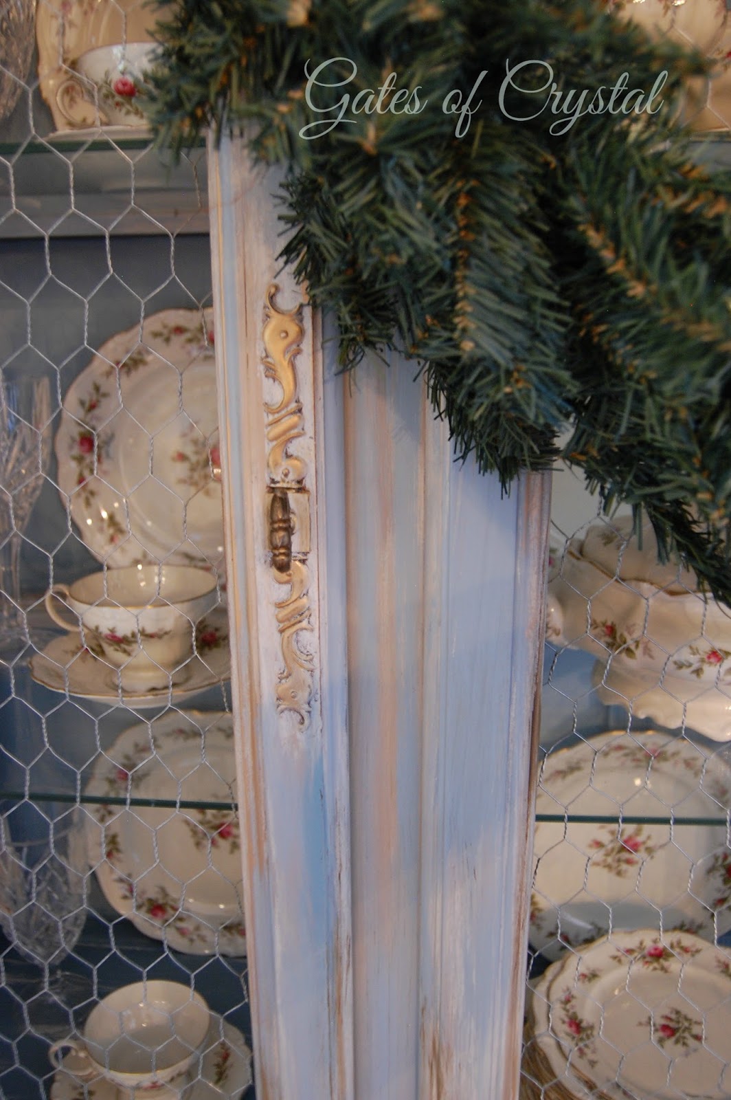 I recently painted our china cabinet a soft blue. I also lightened the deeper blue that I had on the back inside the cabinet.