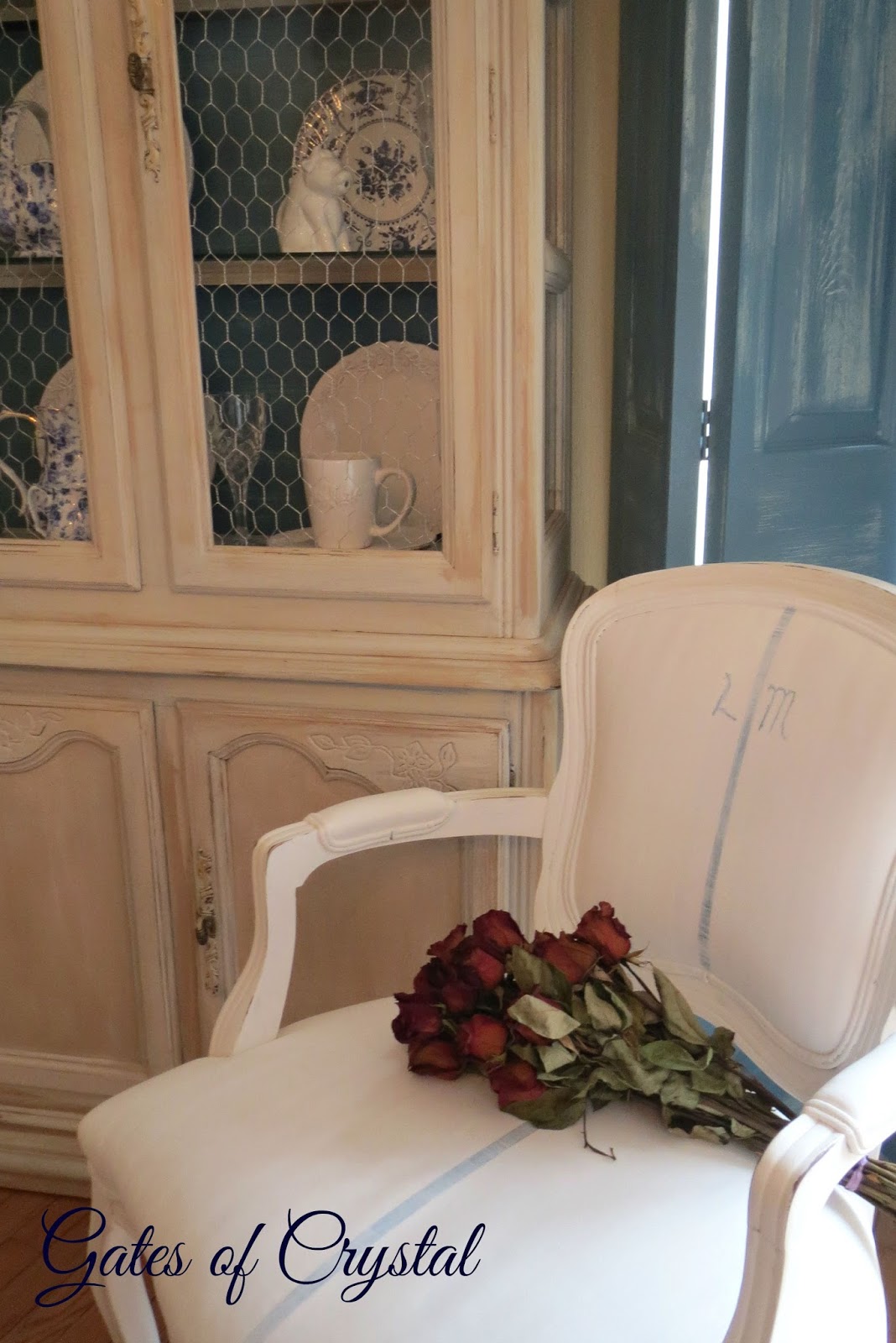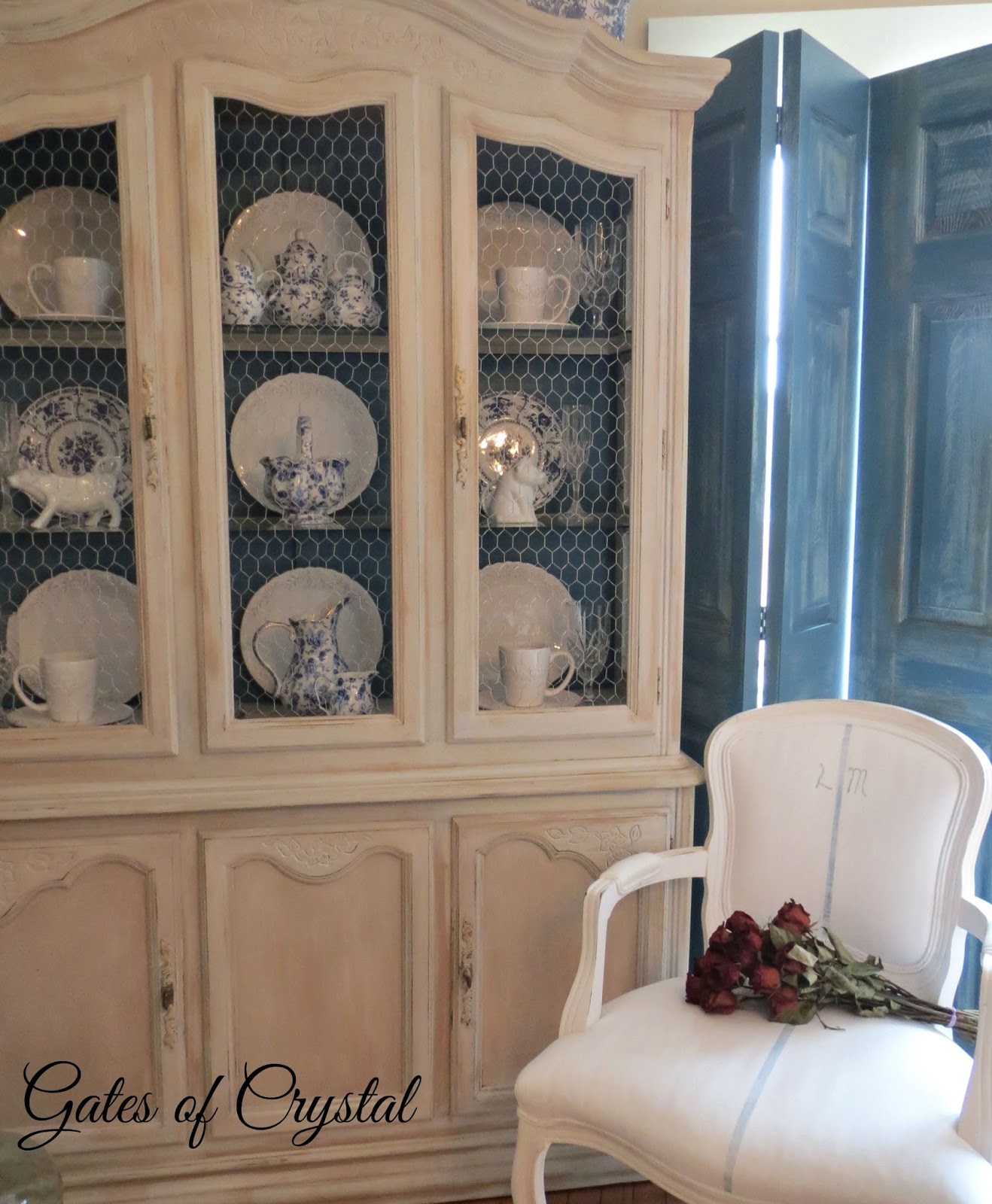 I recently painted our china cabinet a soft blue. I also lightened the deeper blue that I had on the back inside the cabinet.