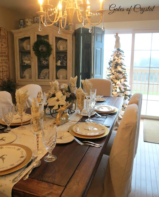 I replaced my large sleigh centerpiece with this small wooden sleigh and some gold deer that echo the plate pattern. Faux evergreen boughs line the middle of the table, draped with gold ribbon and ornaments.