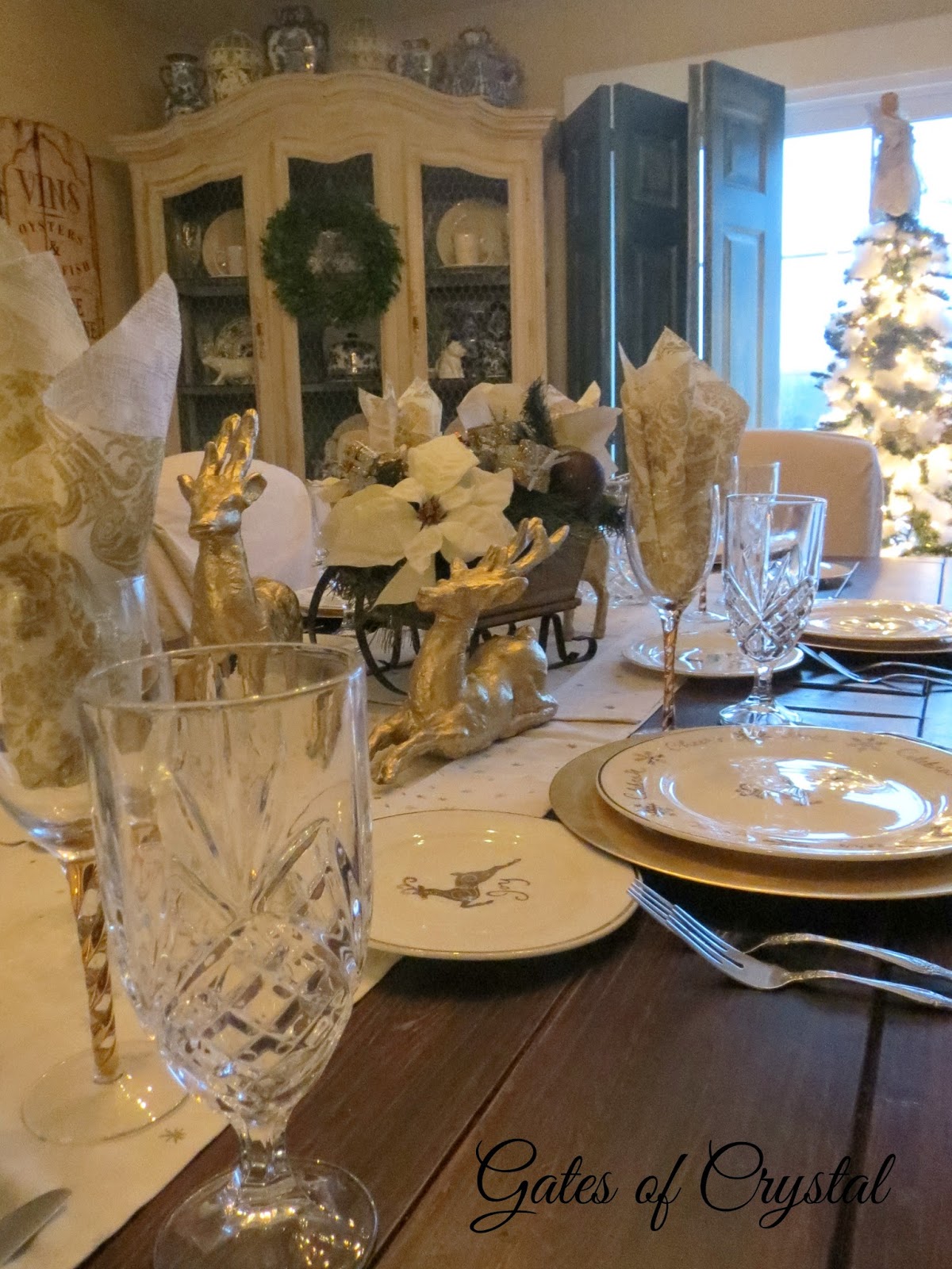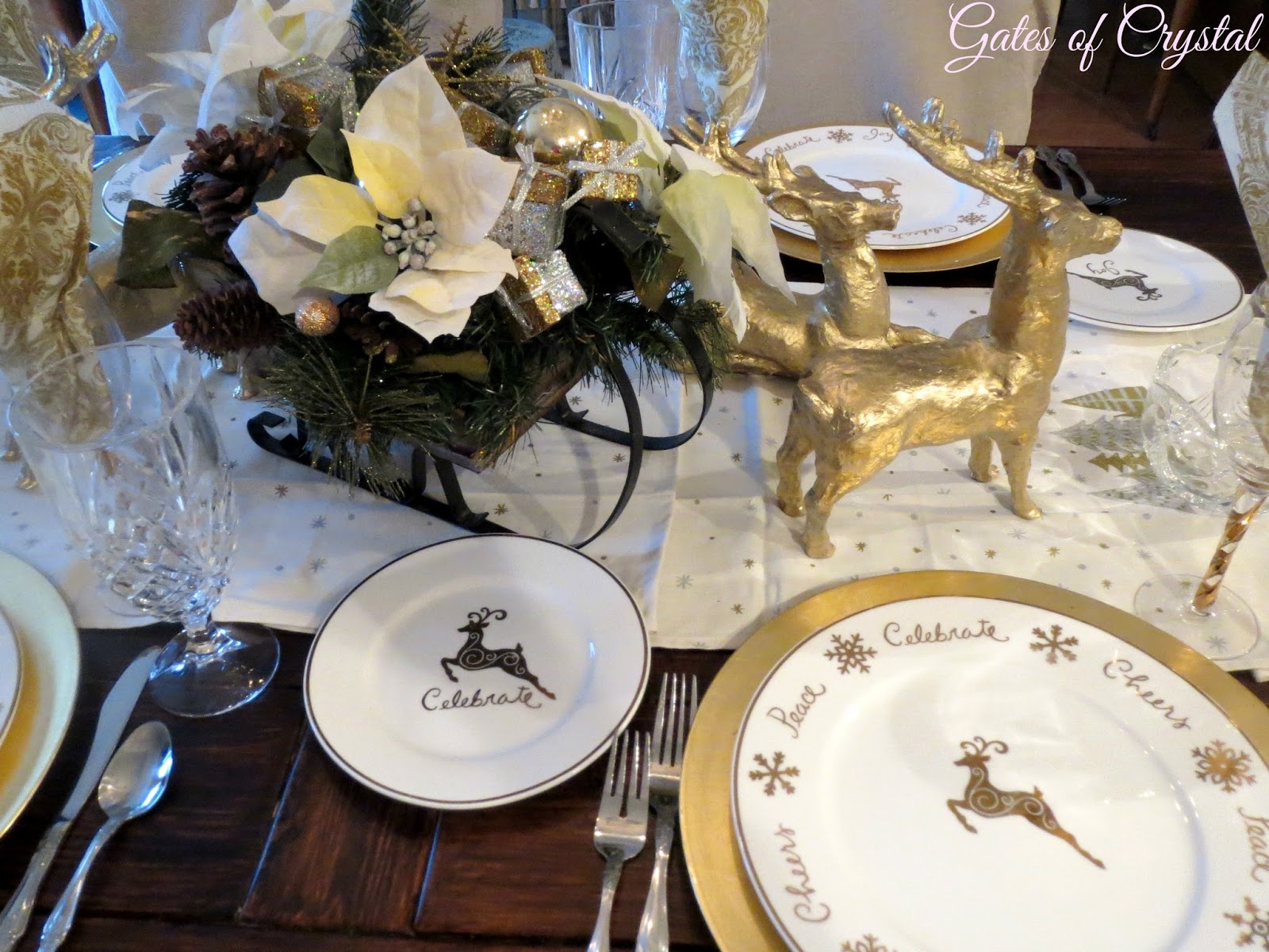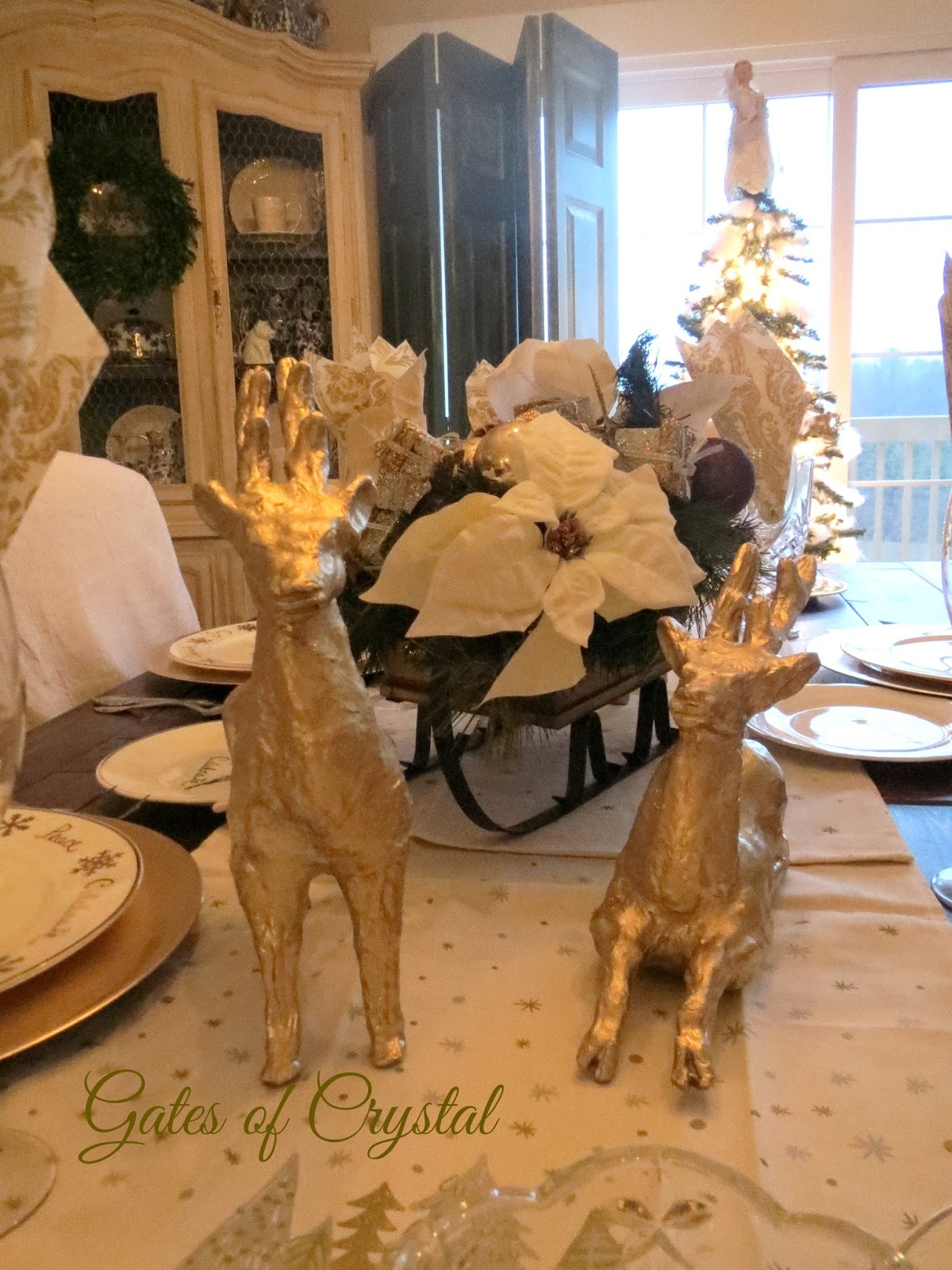 I replaced my large sleigh centerpiece with this small wooden sleigh and some gold deer that echo the plate pattern. Faux evergreen boughs line the middle of the table, draped with gold ribbon and ornaments.