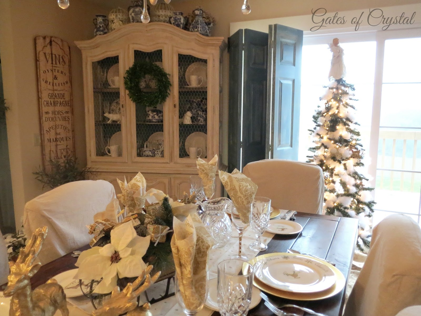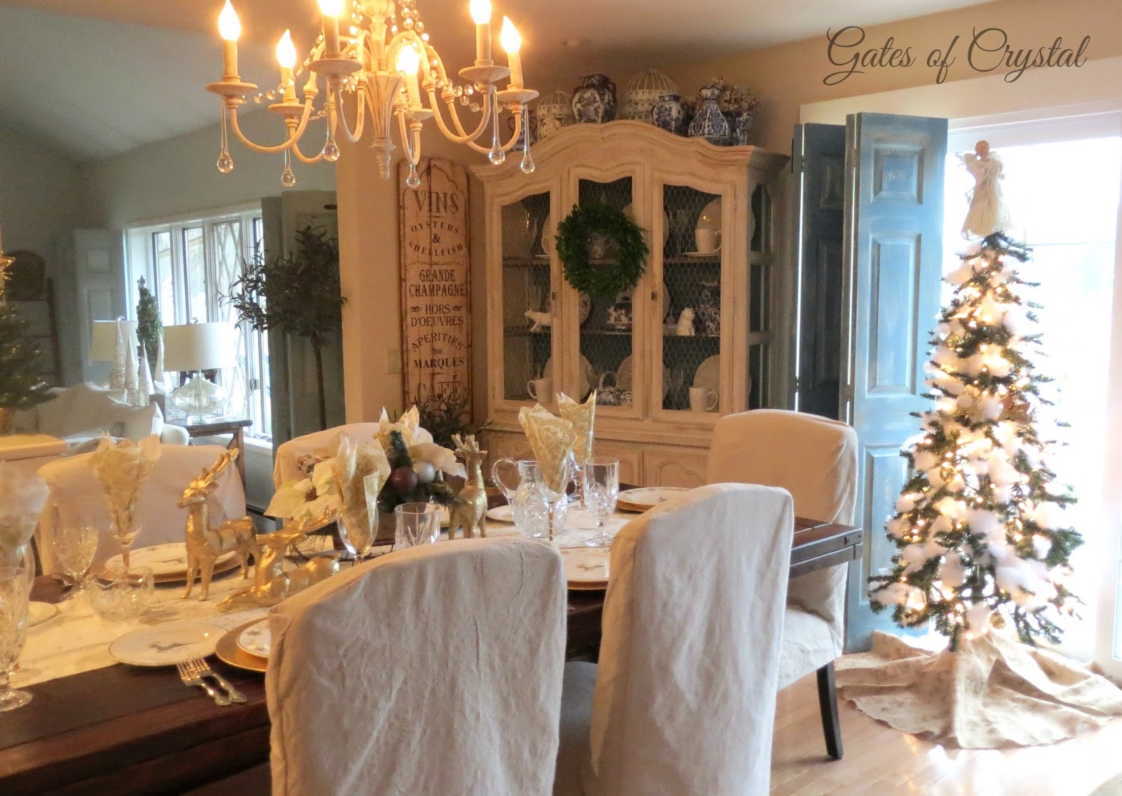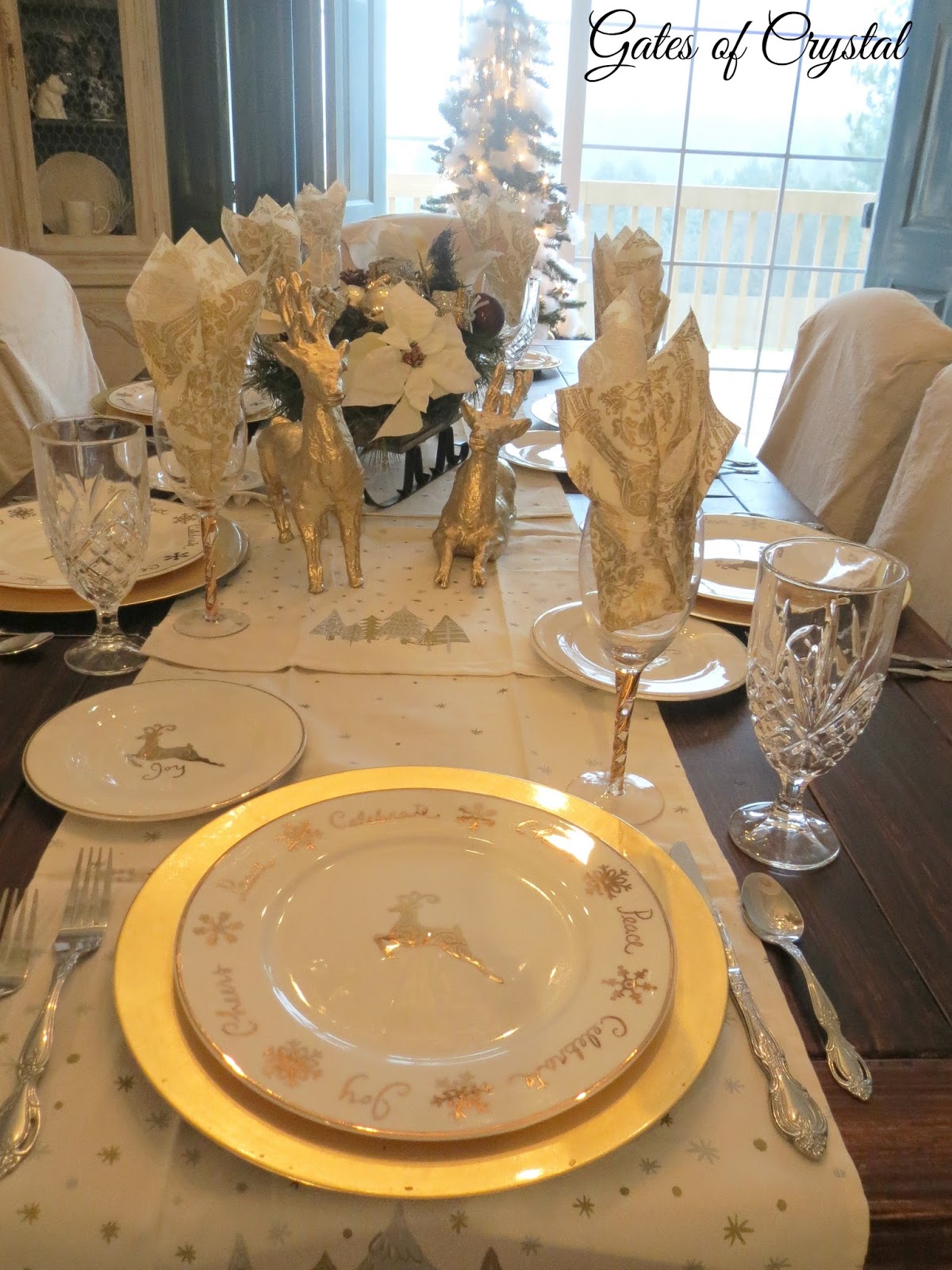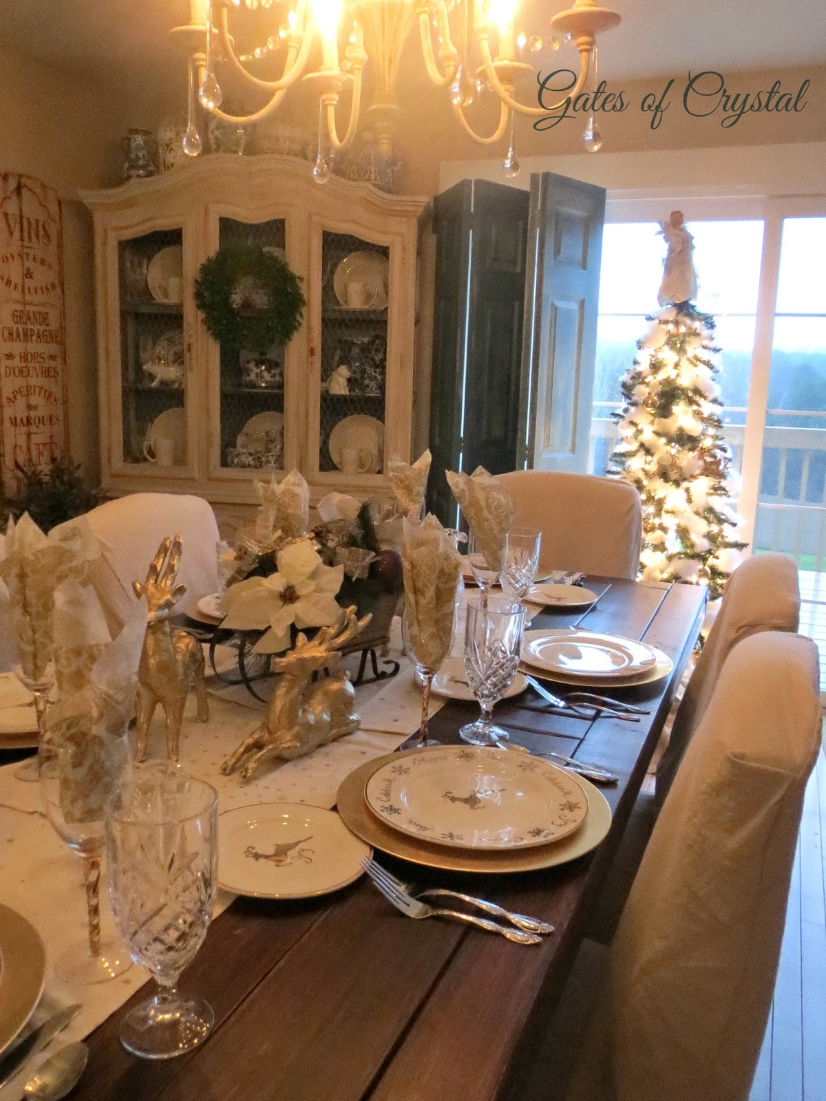 I replaced my large sleigh centerpiece with this small wooden sleigh and some gold deer that echo the plate pattern. Faux evergreen boughs line the middle of the table, draped with gold ribbon and ornaments.