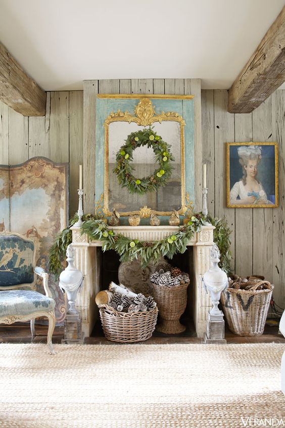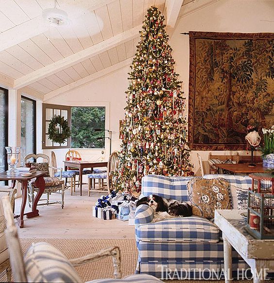 This beautiful room was featured in Traditional Home many years ago. I had the magazine and stared and stared at this photo. I love the mix of rustic, tapestries and fresh blue and white and the tree is filled with vintage ornaments, including some reds and golds. Mr. Faudree was probably the start of my love for French Country. I'm sure he was for many others, too!