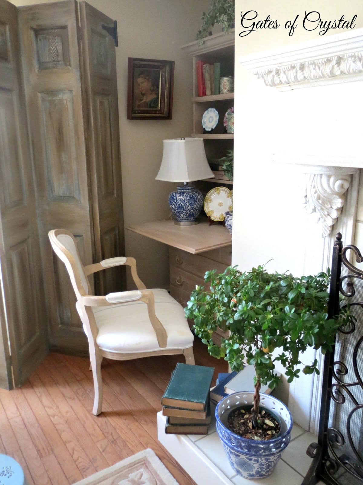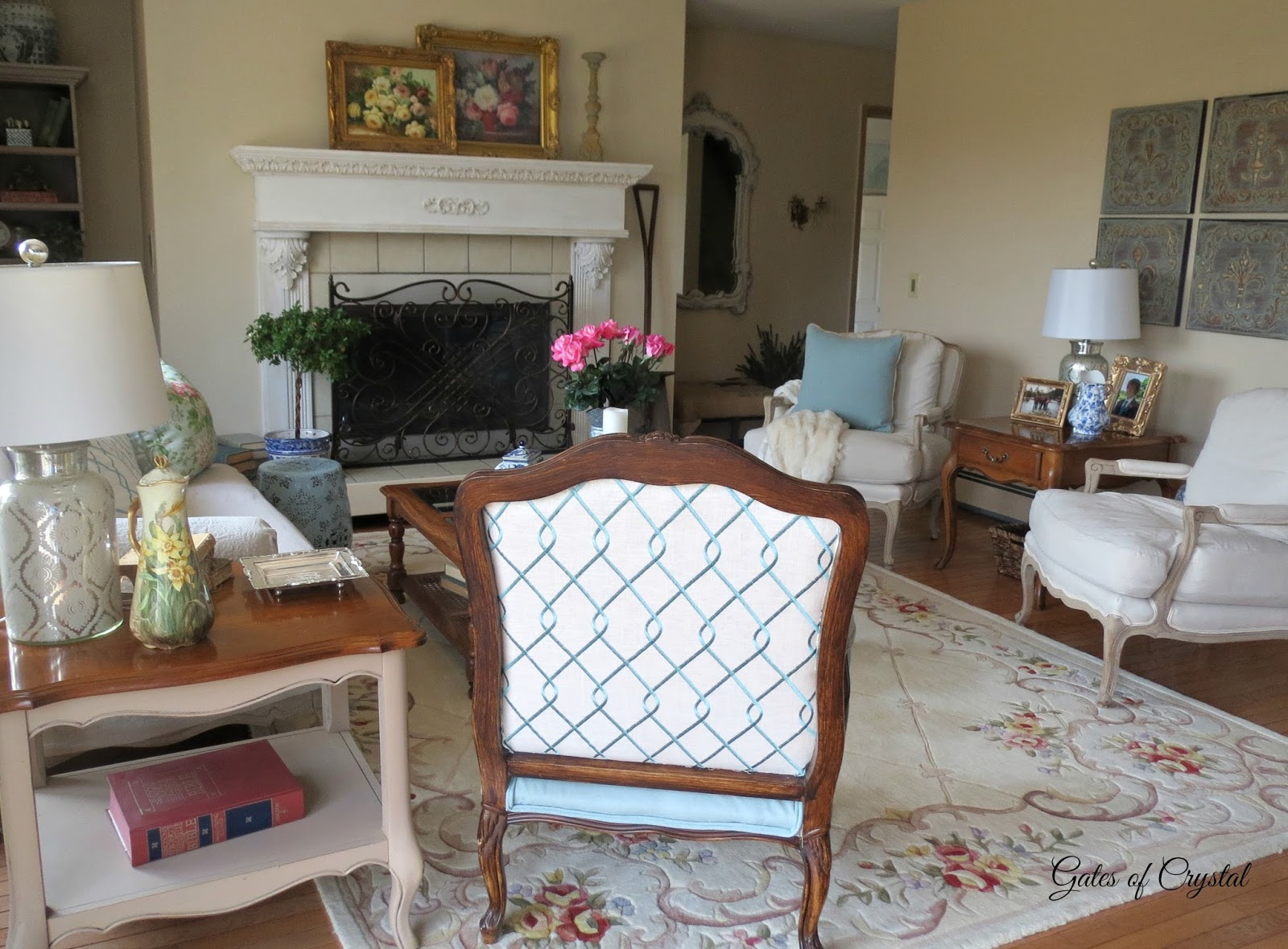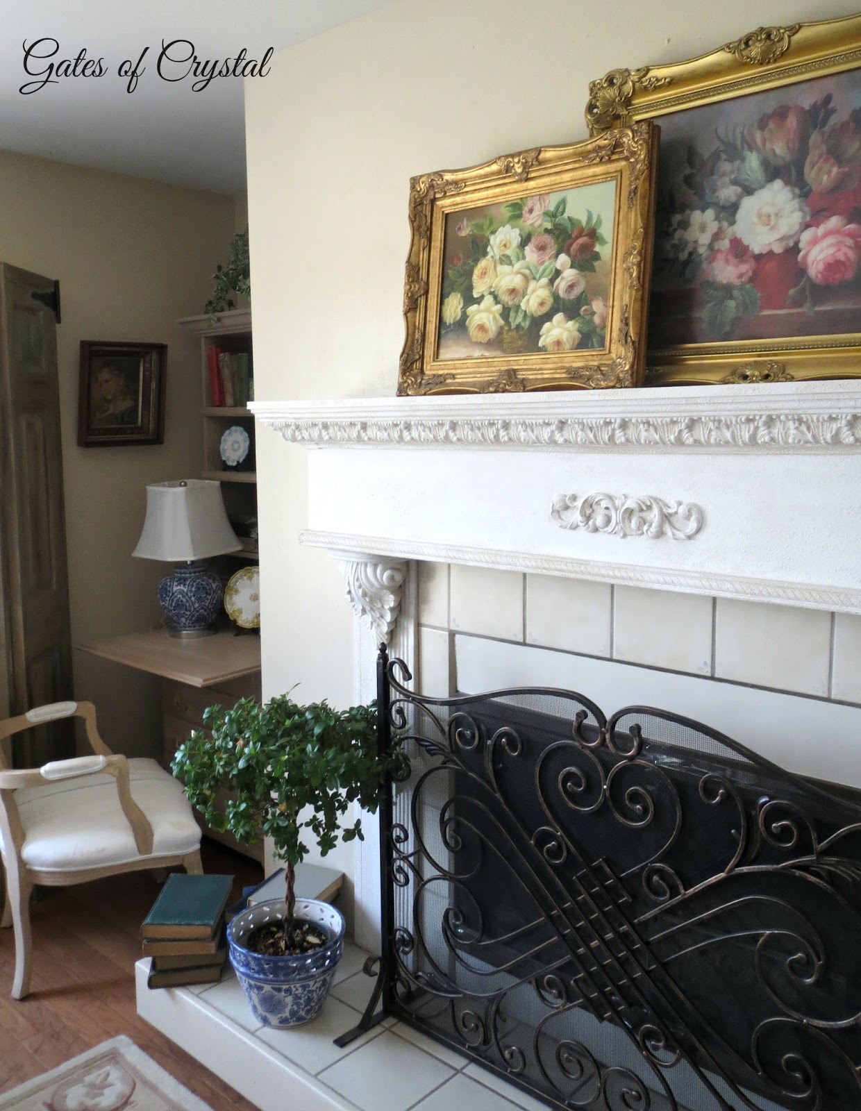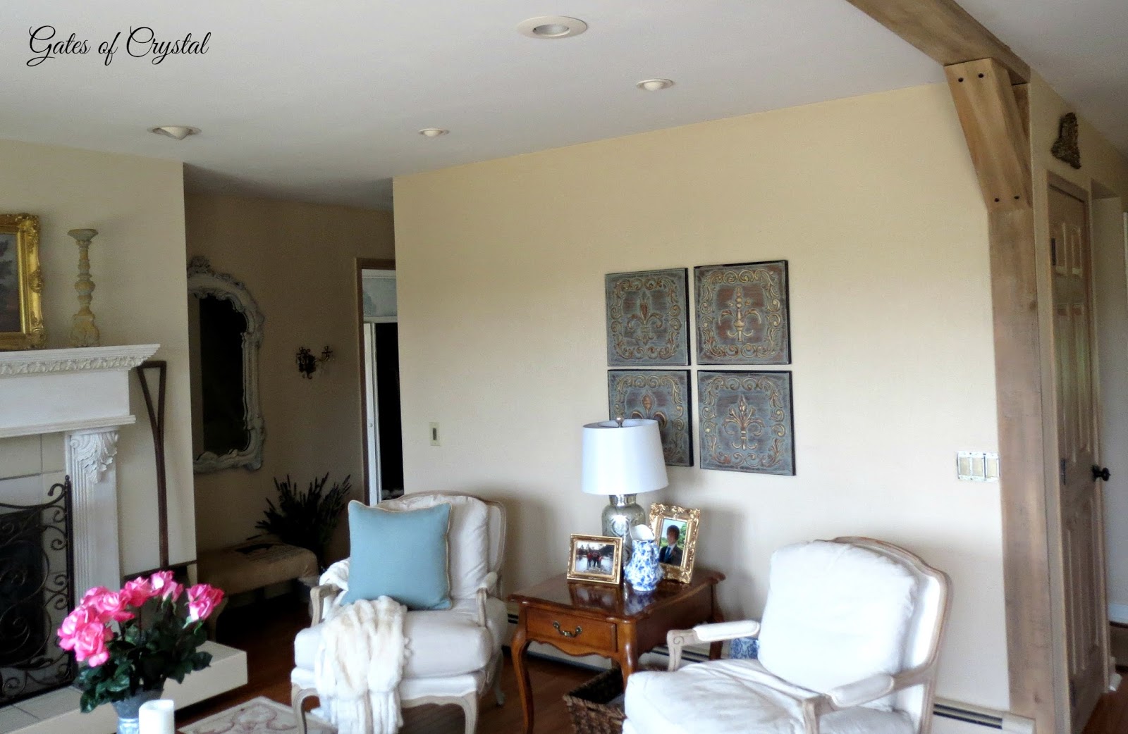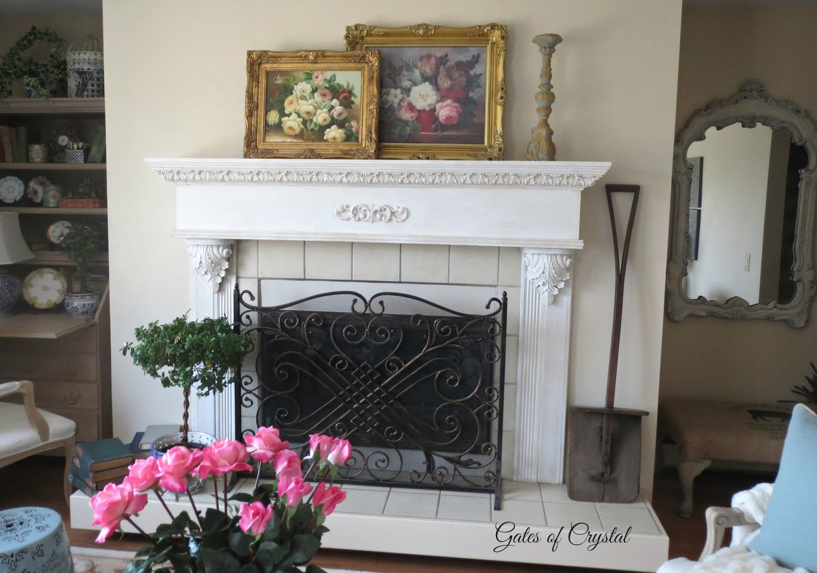 The other big change is our fireplace. Our fireplace mantel, that my husband built many years ago, was white and we had added moulding that went to the ceiling. When the walls were blue, it set the fireplace apart, but because we were painting the walls a more neutral color, I didn't like the white going to the ceiling. So my husband built a French trumeau for each of our fireplaces on the main floor.