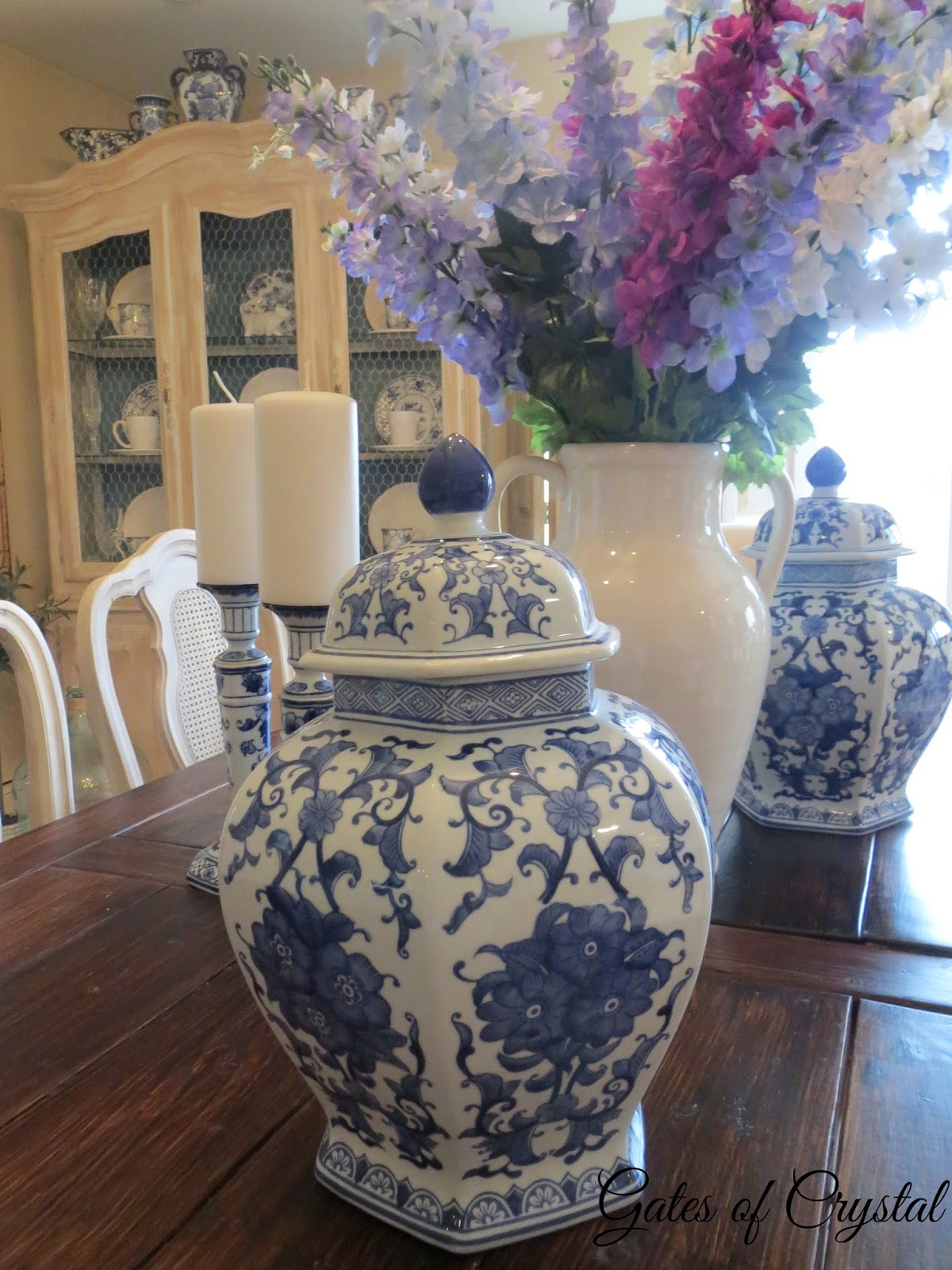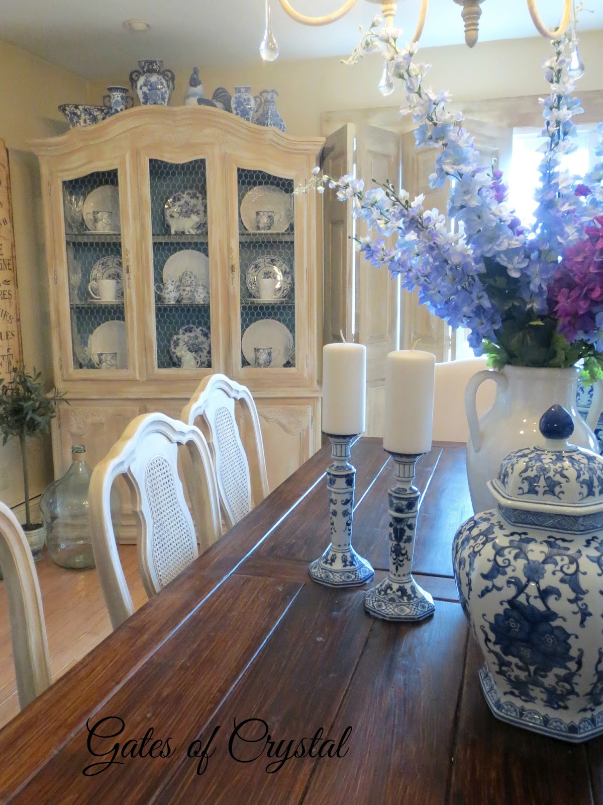 I had originally covered the cane-backed dining room chairs with the same drop cloth. But after finding this toile and the coordinating ticking, I decided to recover them with ticking. I added a few layers of batting before adding the fabric to make them more comfortable. I got these beautiful delphinium from our local florist ~ Megan at This and That. If you live in the Big Rapids area, be sure to visit her beautiful shop! She special~ordered these and had them waiting for me the day before the shoot. I used to have these growing in my yard but they didn't survive one of our cold Michigan winters. They are one of my favorite flower because of beautiful blues.