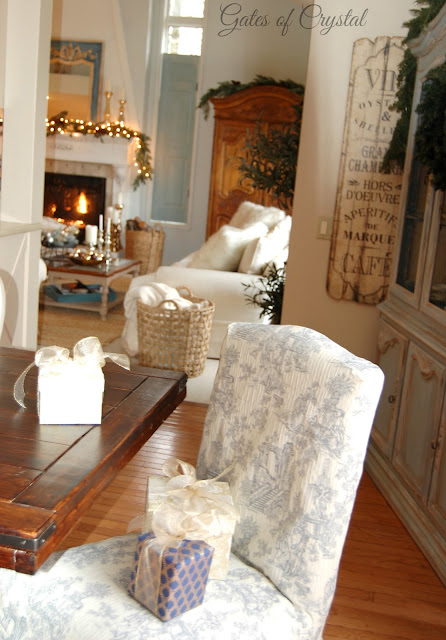 This year I decorated it in blue and gold to go with the toile and ticking in here and the living room.