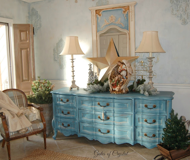 I ordered this teal velvet on line, which is always a risk, but when it arrived it was even more delicious than I had imagined. I had ordered all they had left and had just enough to cover the settee and make a pillow. I love the dramatic pop of color it gives to this room. I found an almost identical teal velvet home decor fabric at our nearby Joann's Fabric and am thinking about using it elsewhere in our house.When I painted the blue buffet, I bought a sample-sized paint this same teal color and used it to deepen the color in the corners.