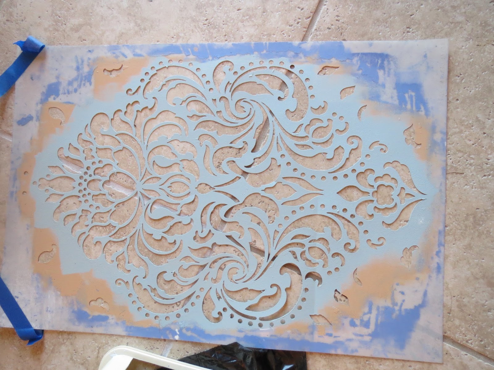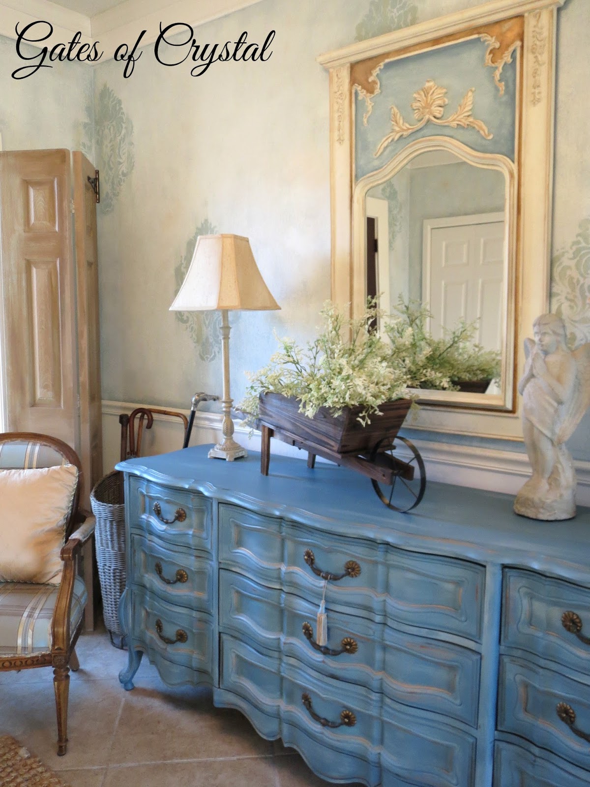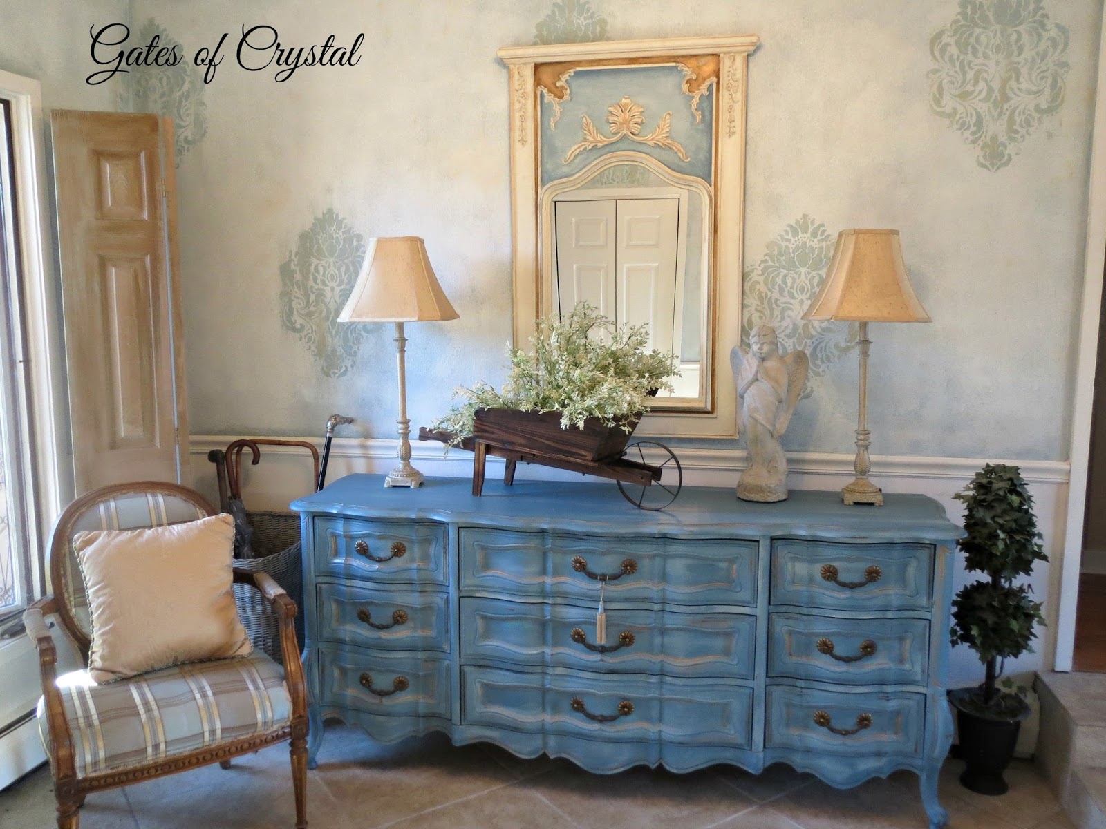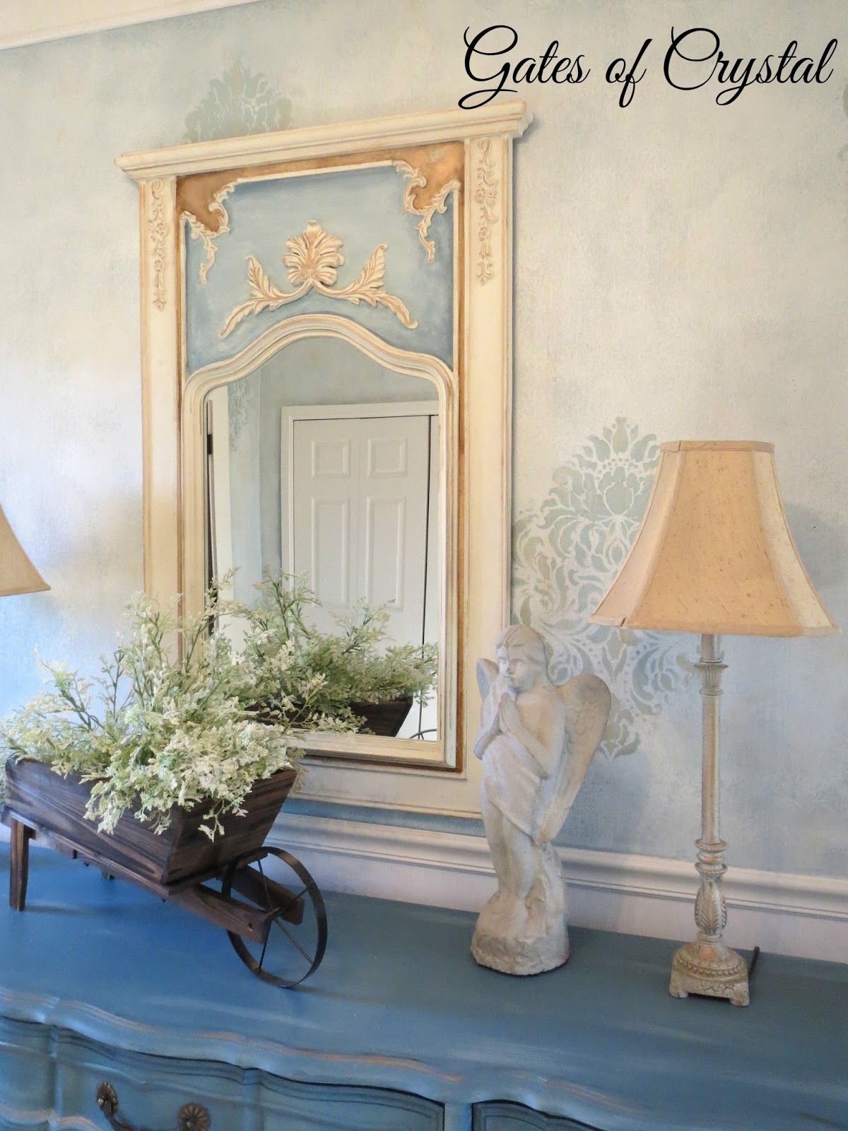 I added a little of the light blue to our HomeGoods mirror so that it coordinated better. This mirror was on clearance at HomeGoods a couple of years ago. It was all a uniform cream color and I painted it to match the dresser.