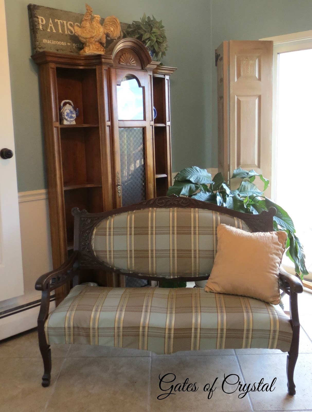 I haven't shown you the other side of the room in a while. I'll share more details about recovering the antique settee on another post. I'd like to change our light fixtures in here to a soft gold, whether I refinish the ones we have or buy new ones.