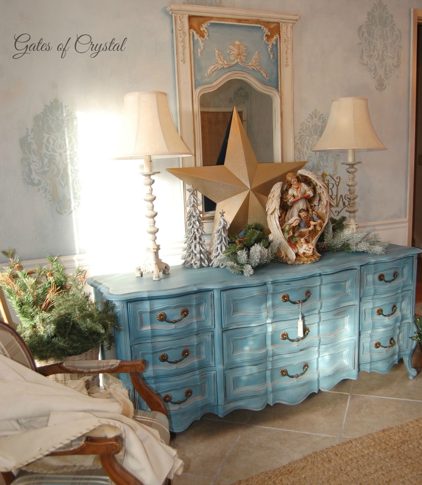 I ordered this teal velvet on line, which is always a risk, but when it arrived it was even more delicious than I had imagined. I had ordered all they had left and had just enough to cover the settee and make a pillow. I love the dramatic pop of color it gives to this room. I found an almost identical teal velvet home decor fabric at our nearby Joann's Fabric and am thinking about using it elsewhere in our house.When I painted the blue buffet, I bought a sample-sized paint this same teal color and used it to deepen the color in the corners.
