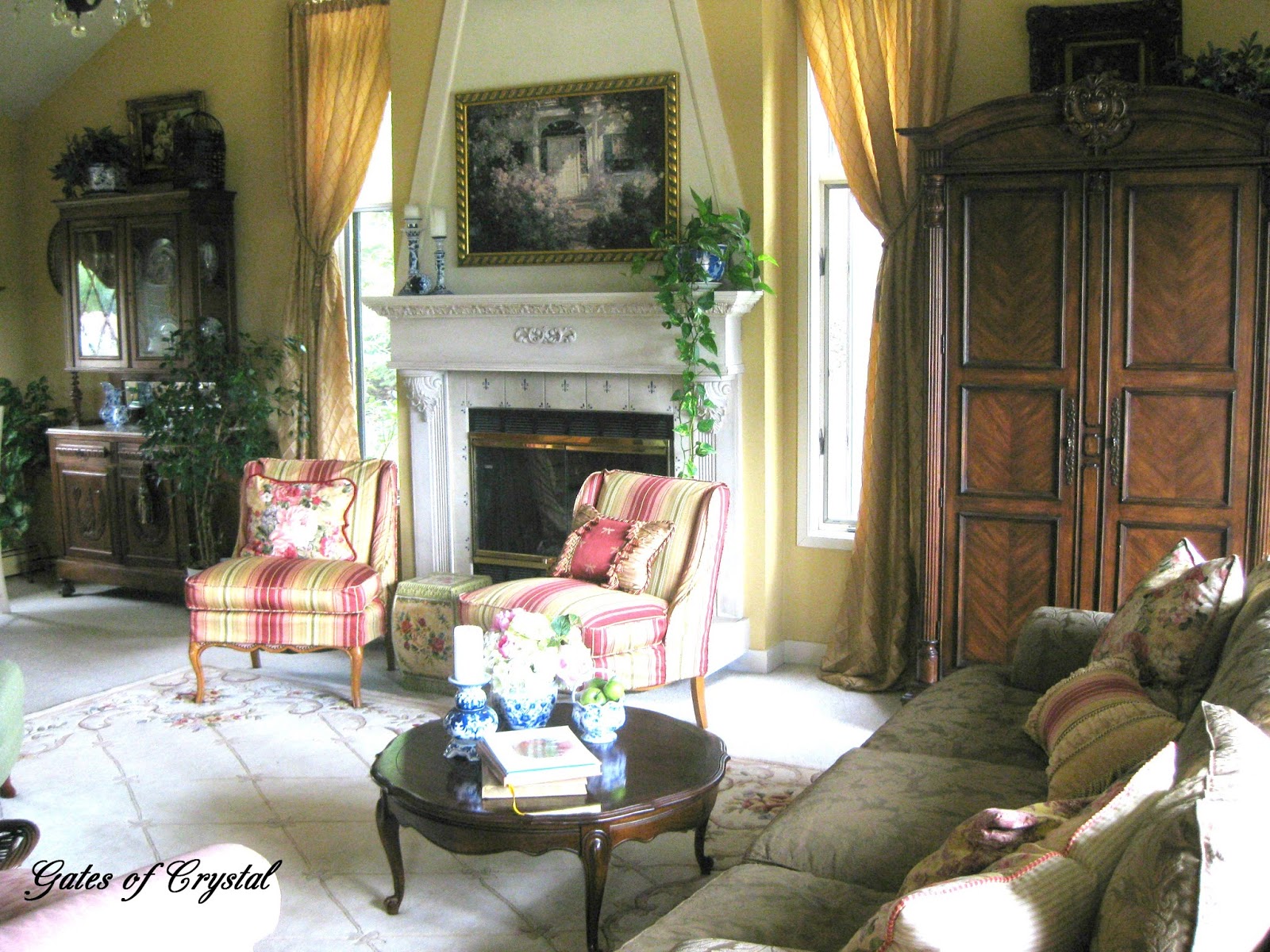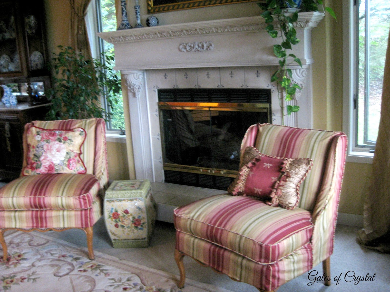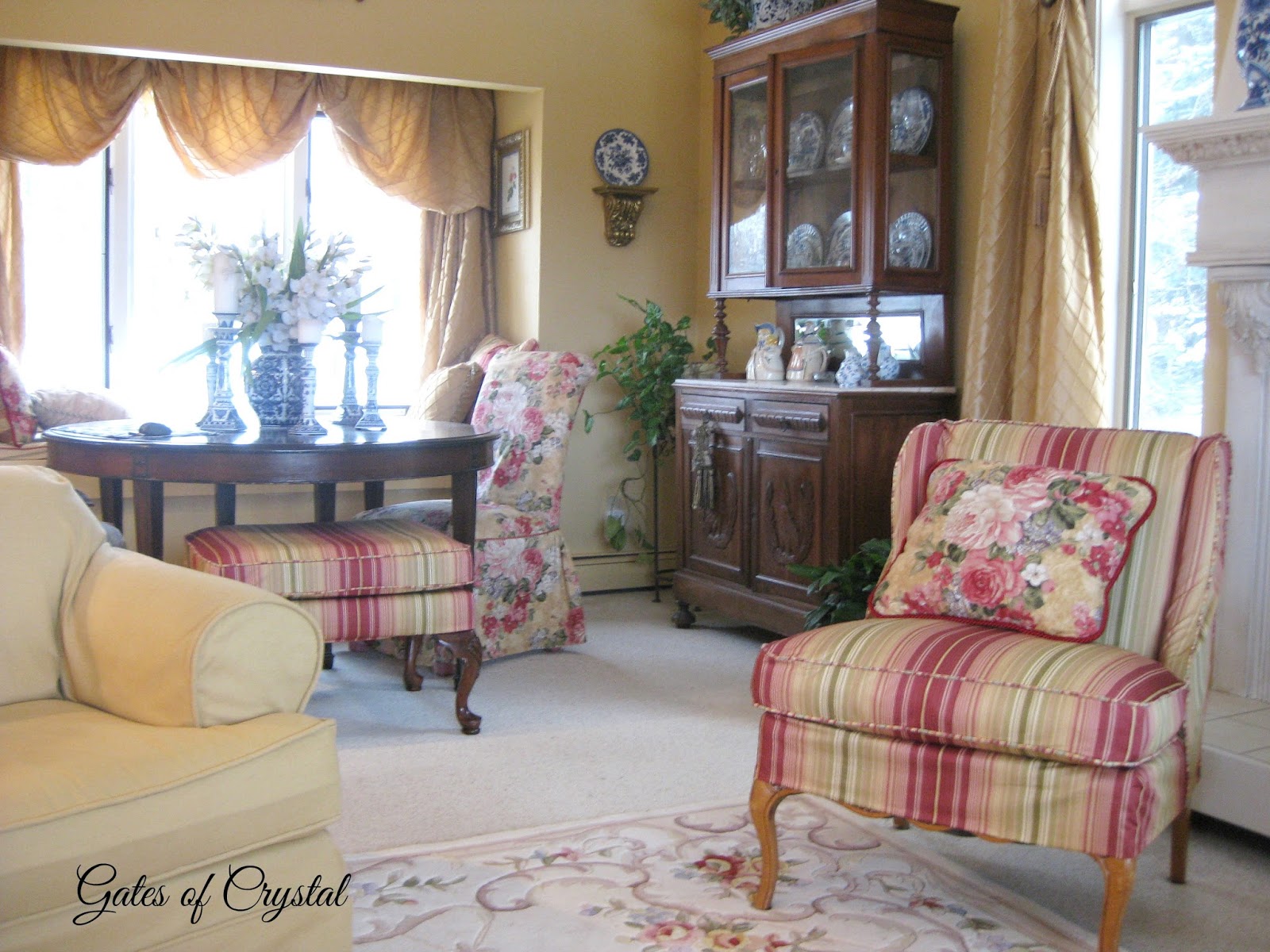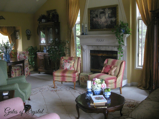 I haven't shown you the other side of the room in a while. I'll share more details about recovering the antique settee on another post. I'd like to change our light fixtures in here to a soft gold, whether I refinish the ones we have or buy new ones.