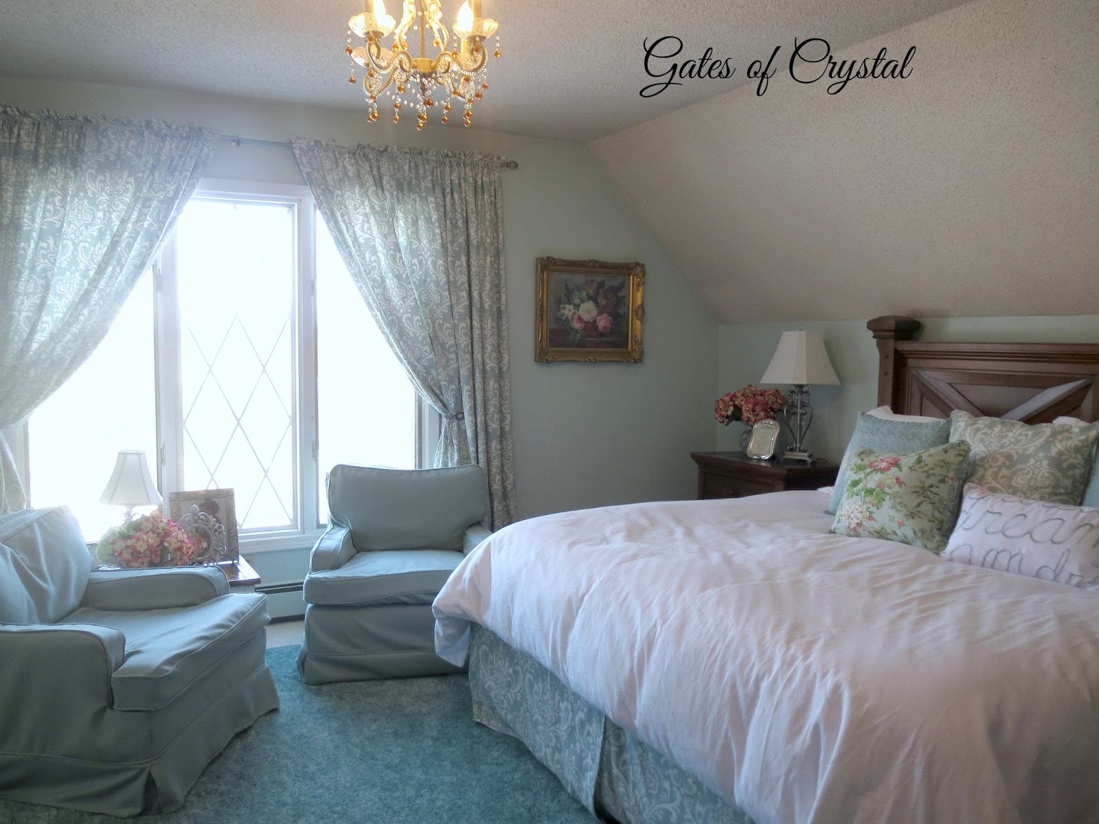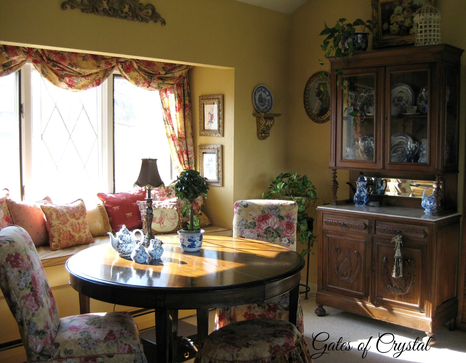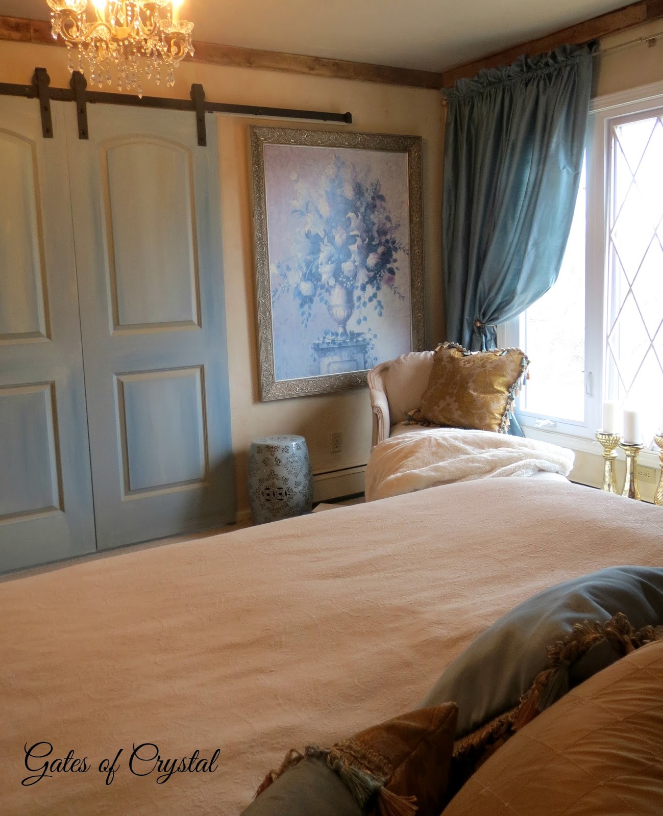 I haven't shown you the other side of the room in a while. I'll share more details about recovering the antique settee on another post. I'd like to change our light fixtures in here to a soft gold, whether I refinish the ones we have or buy new ones.