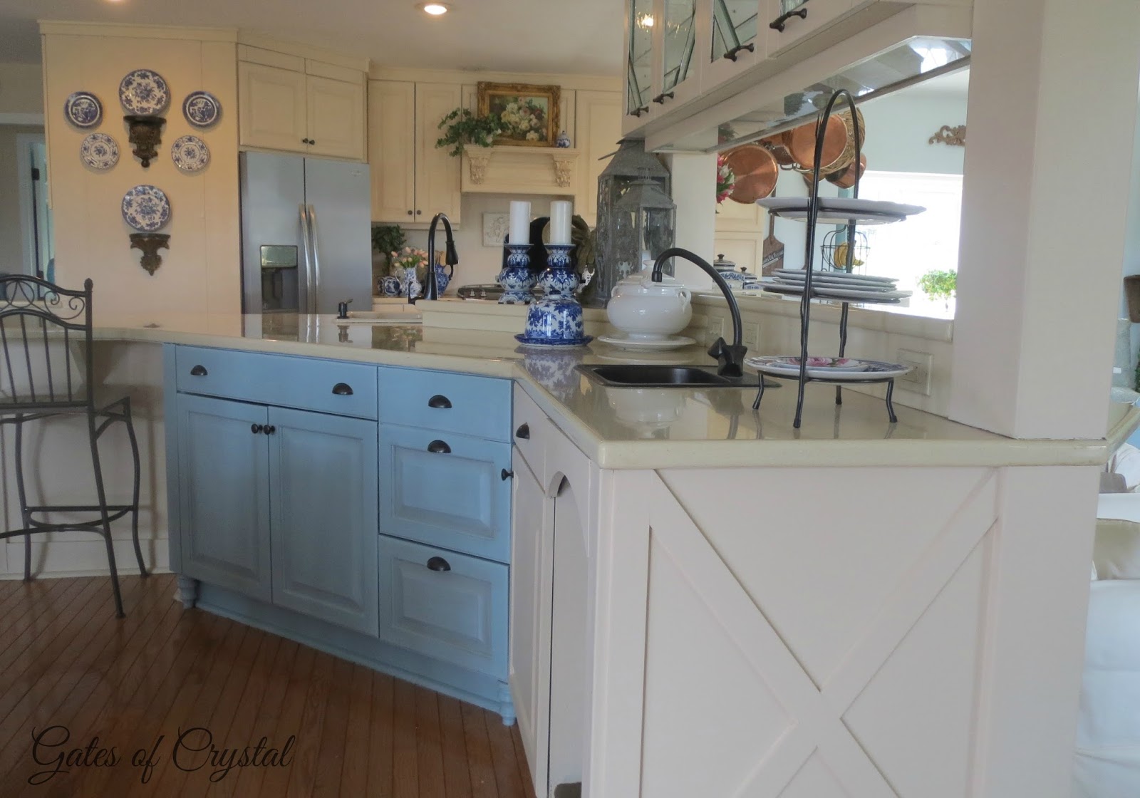 I added a little of the light blue to our HomeGoods mirror so that it coordinated better. This mirror was on clearance at HomeGoods a couple of years ago. It was all a uniform cream color and I painted it to match the dresser.