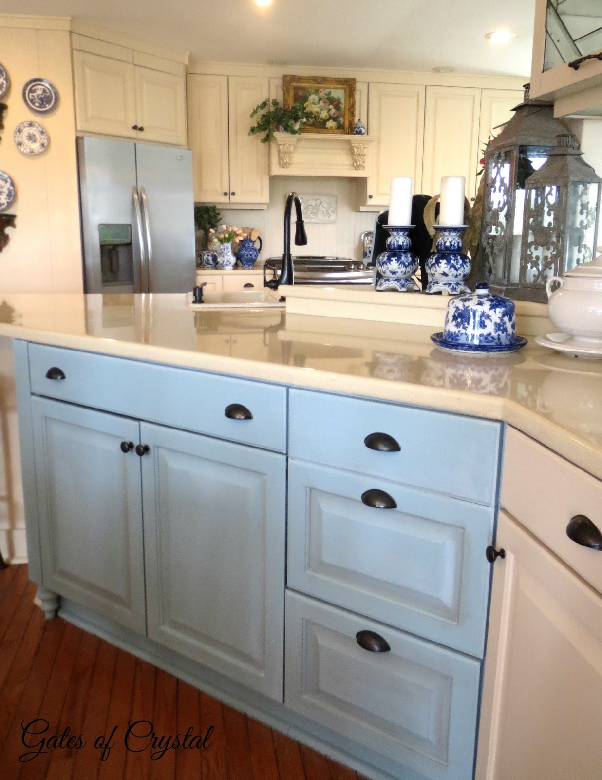 The new color is much lighter and more the color that shows up around our house in almost every room. I'm sorry I can't give you a color name. I used the same color that I custom mixed for our family room a few years ago and then added colors to it and layered it on until I got the look I wanted.I always use a chalk paint additive I bought on Amazon. It gives your paint that smooth chalky finish but I can add it to any color that I already have.