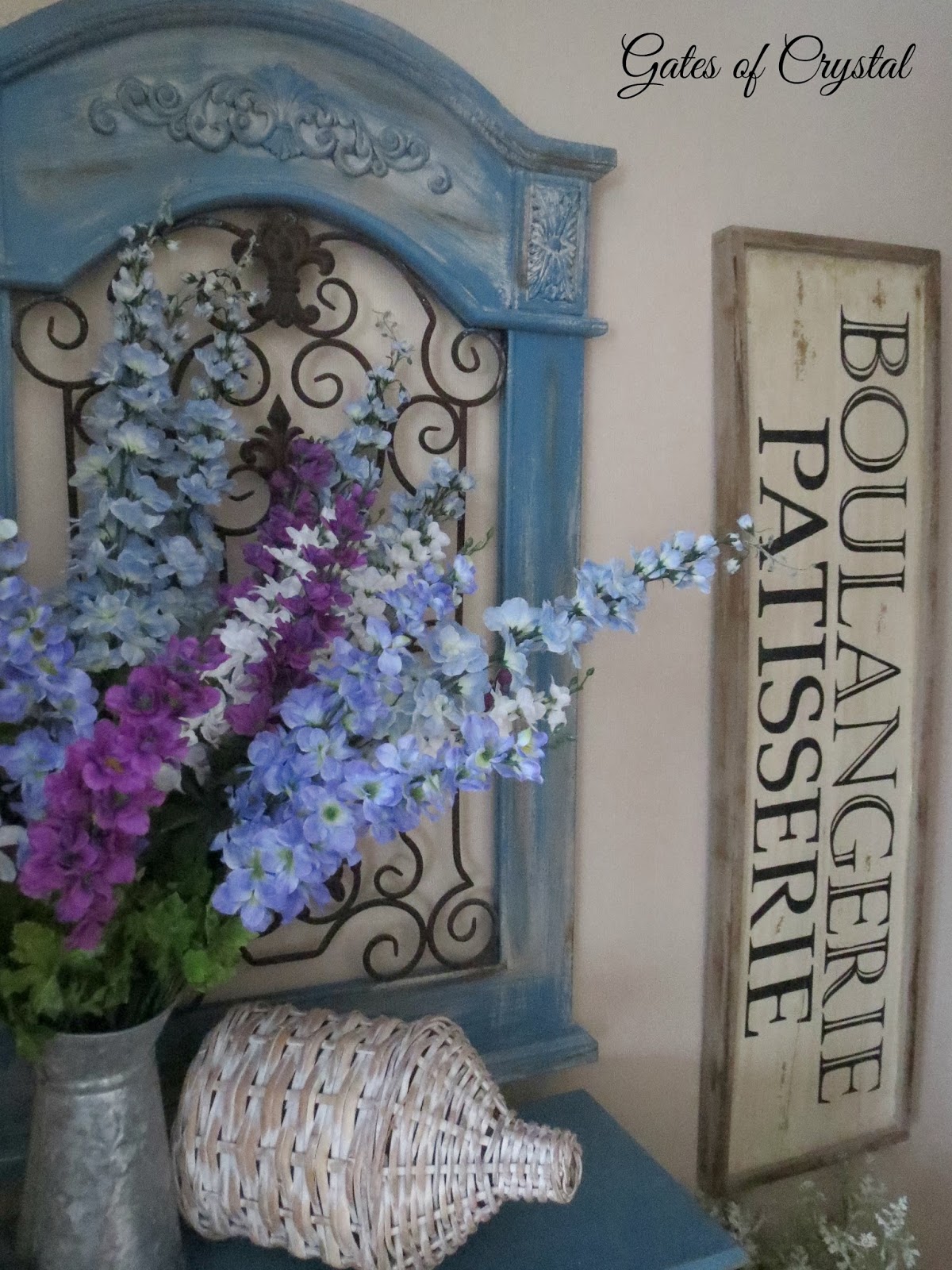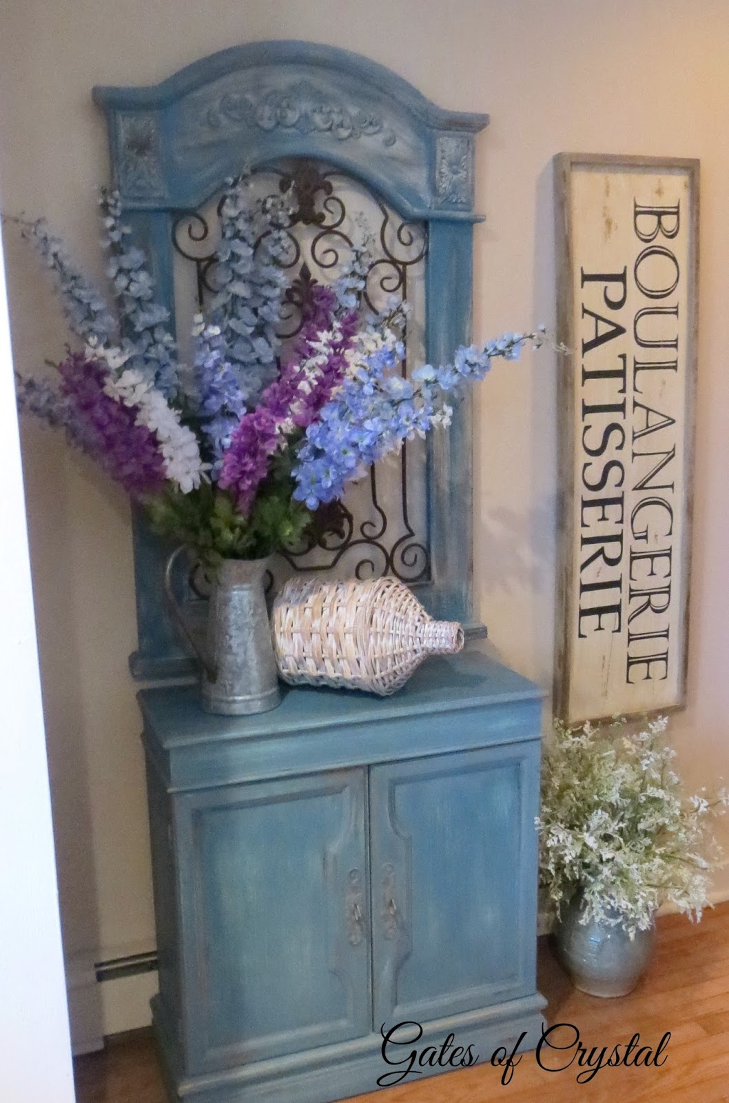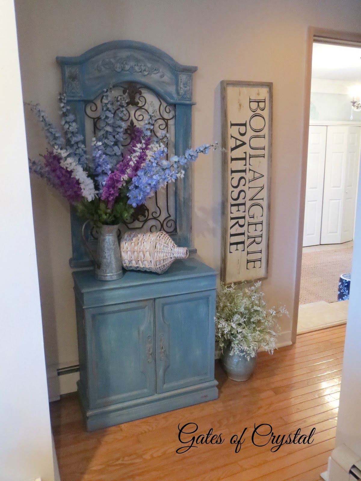The little cabinet on the left I found at my favorite used furniture store in Grand Rapids. It had kind of a funny paint job and so I gave it an update with chalk paint. I've moved it around a couple of times but if ends up staying here, I may paint it again.