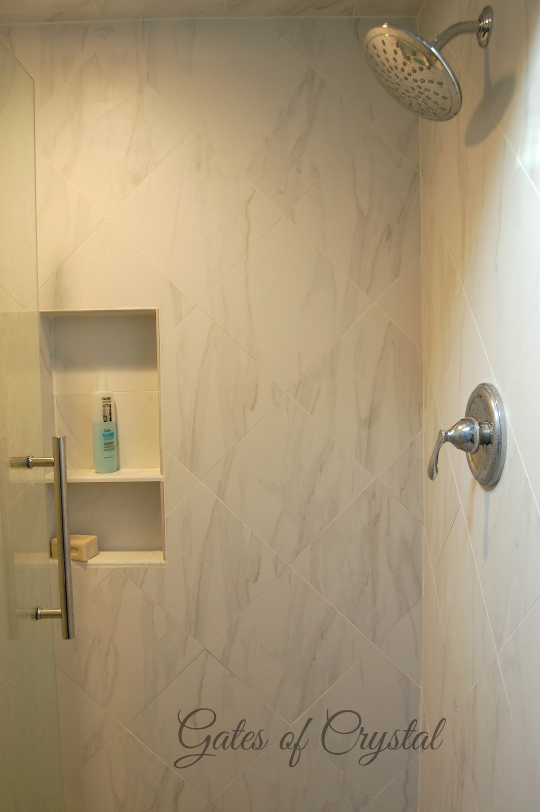 Our tile expert set the tile so that the vein was flowing vertically. Our shower is double with a rain head on one side and a hand-shower on the other.