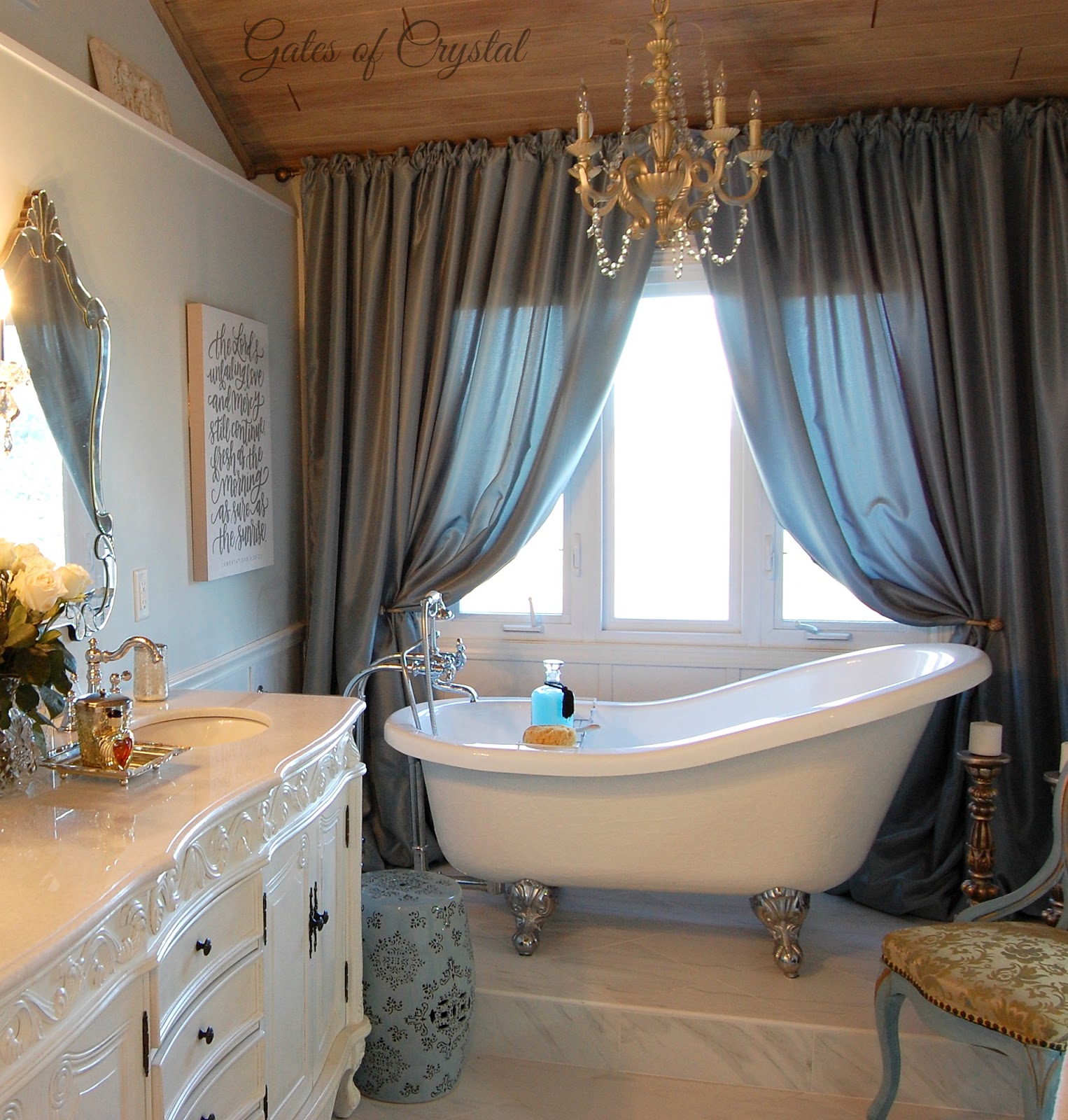 It softened the ceiling nicely, giving it the rustic wood feel that I love. The chandelier in here is the same. I removed the crystals and then gave it a coat of antique white paint, then a coat of gold and silver.