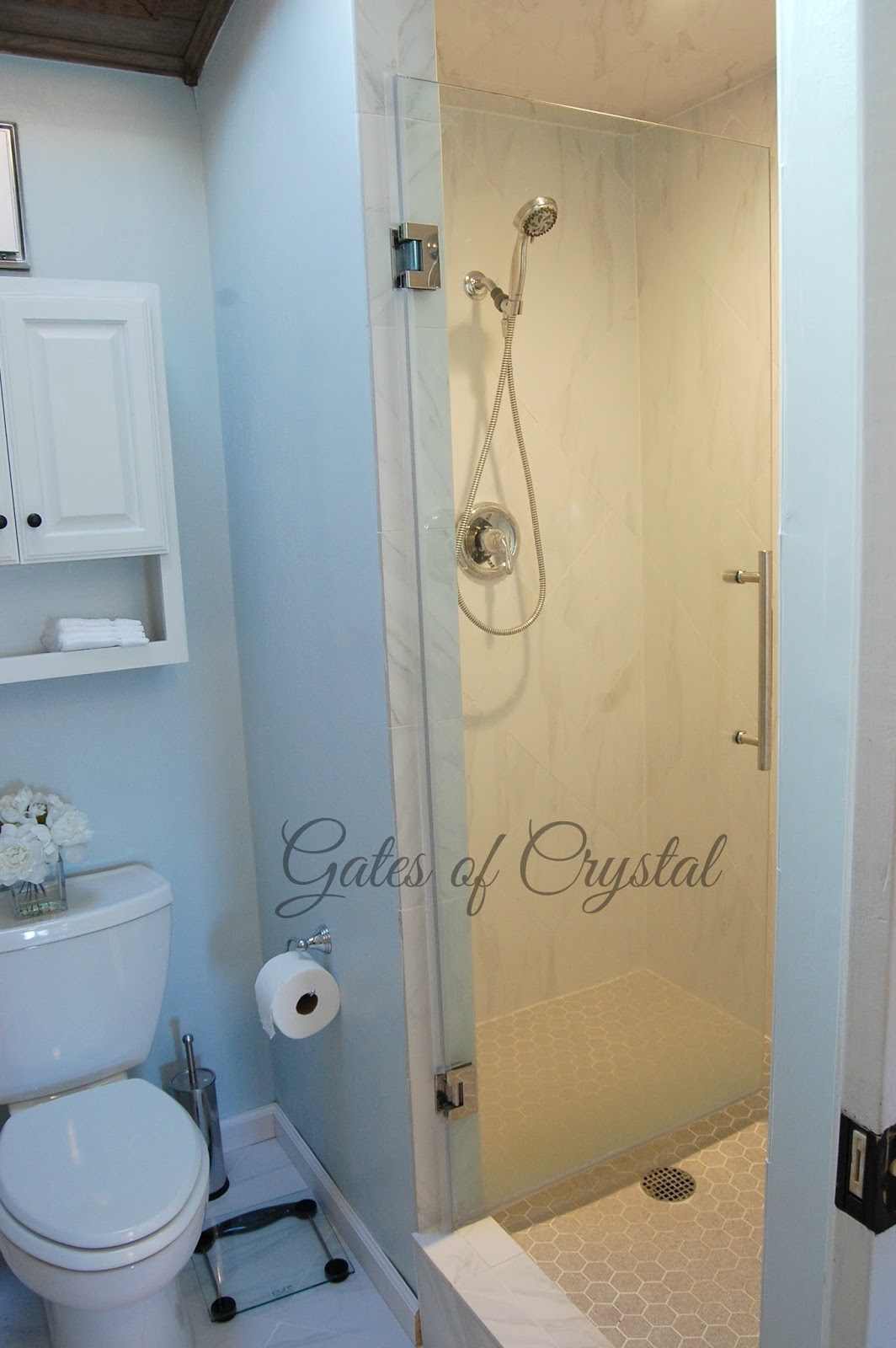 Down a hallway, lined with closet doors, is our toilet/shower room. We used the same tile in our shower as the floors. It's a marble-looking porcelain set on a diagonal with a very small grout line. I loved this tile because although I could not get a very clear picture, there's also a faint gold edge to gray veining. The floor is a preset octagonal tile in a coordinating gray.