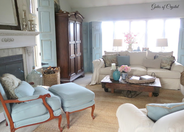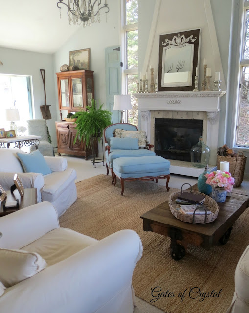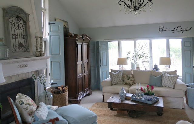The trees are in bloom here now. I've added some branches and a bird cage to the table behind the couch.